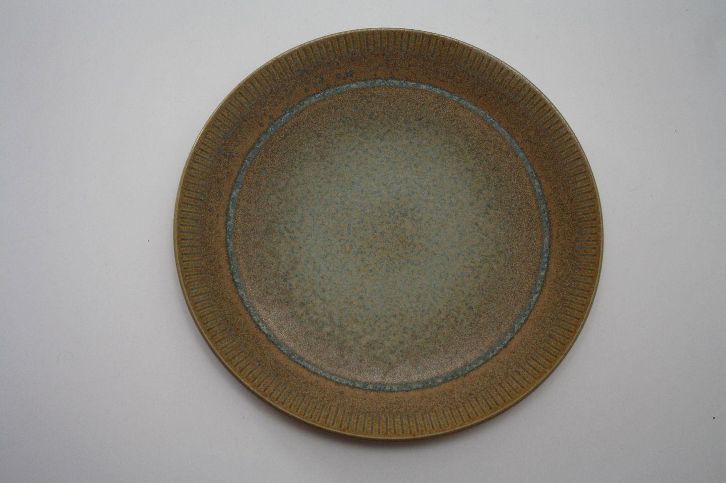 Knabstrup stoneware, Knabstrupstellet i azurfarvet glasur. Frokosttallerken. Diameter 22 cm. Pris: solgt Fad eller ekstra stor middagstallerken. Diameter 28,5 cm. Pris: SOLGT