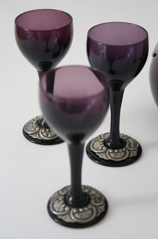 Violet karaffel, højde 28 cm. og 5 glas, højde 9,3 cm. med tin ornamenter. Pris samlet 900 kr. Hel og fin stand. SOLGT