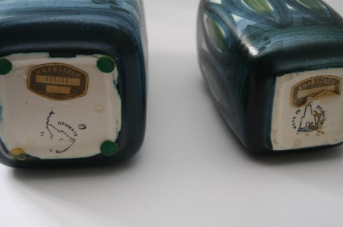 Knabstrup keramik, Dekoreret af Waltraud Praschak og formgivet af Günther Praschak 1966-70. Stor kande. Perfekt stand. Højde 20,5 cm. Bredde 10 cm. Pris: SOLGT Mellem kande. Perfekt stand. Højde 16 cm. Bredde 7,5 cm. Pris: SOLGT