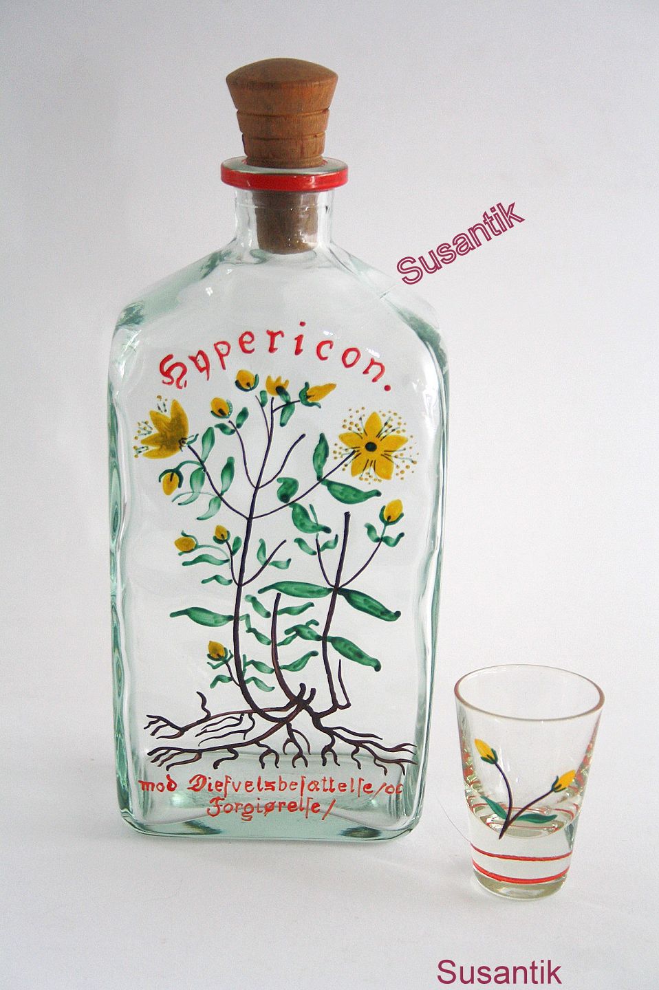 Holmegaard glasværk, Hypericon, emalje dekoreret karaffel med træprop, designet af Jacob E Bang 1936. Højde uden prop 19 cm. Pris: SOLGT Glasset er solgt.