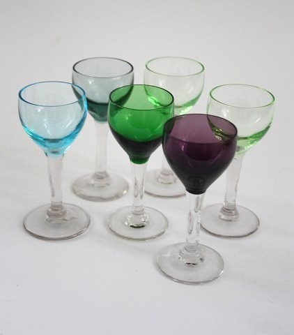 Holmegaard/Fyens glasværk, 3 forskellige slags farvede likør og snapseglas.