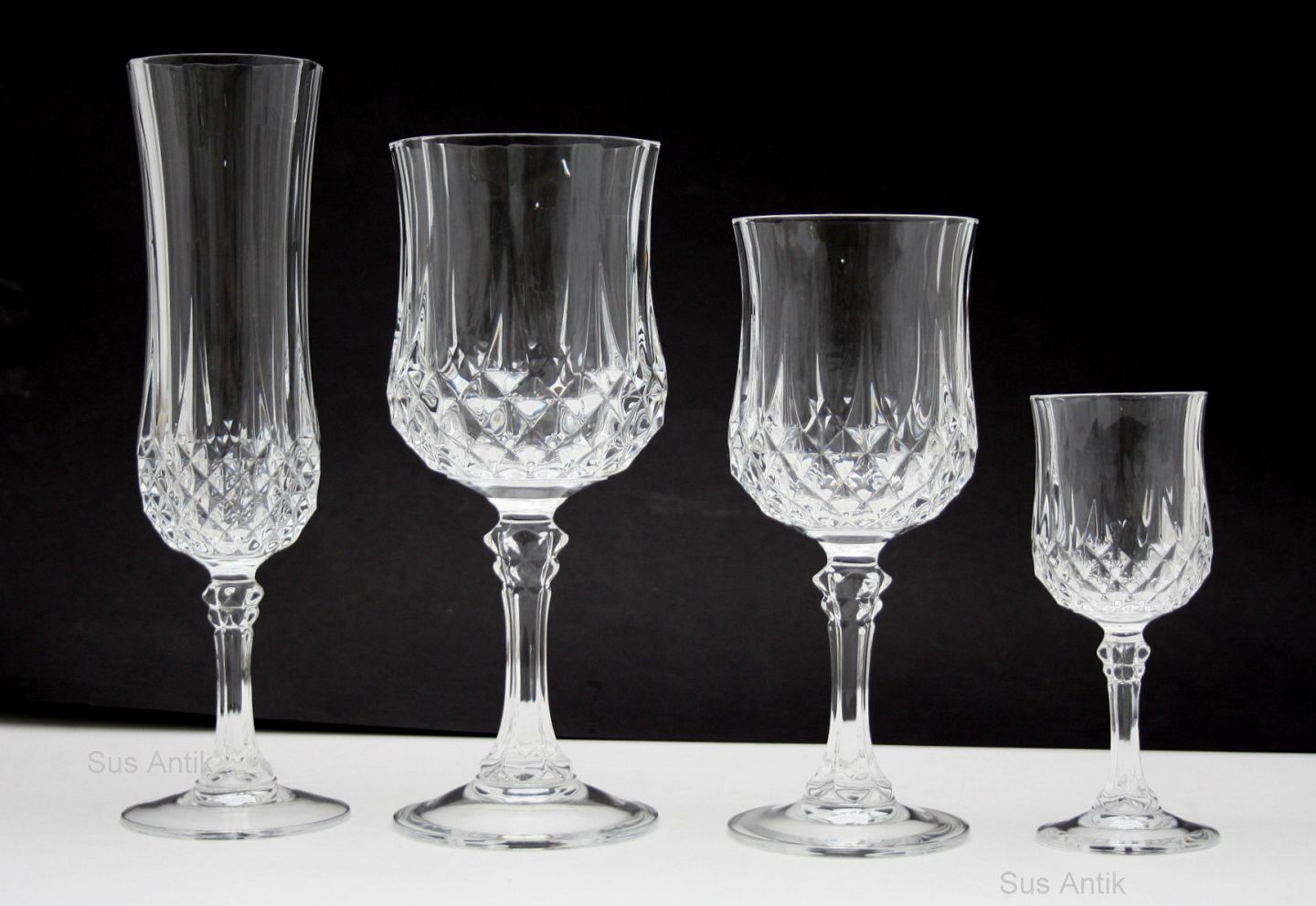 Cristal D'Arques, Longchamp krystalglas. Champagne, højde 20,5 cm. Pris: SOLGT Rødvin, højde 18 cm. Pris: SOLGT Hvidvin, højde 16,5 cm. Pris: SOLGT Portvin, højde 14,5 cm. Pris: 75 kr. stk. Lager: 8 Snaps, højde 11,7 cm. Pris: SOLGT