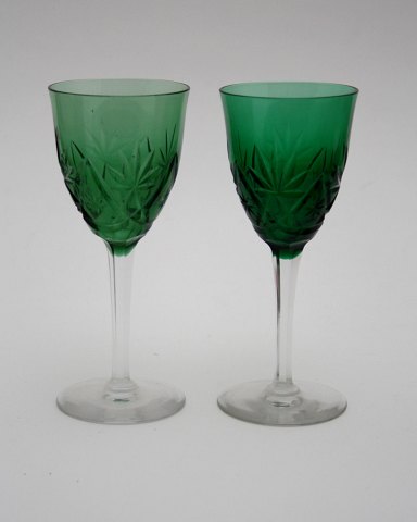 Hvidvin med mørk grøn kumme. Højde 15 cm. Øverste diameter 6,3 cm. Pris: 125 kr. stk. Lager: 6