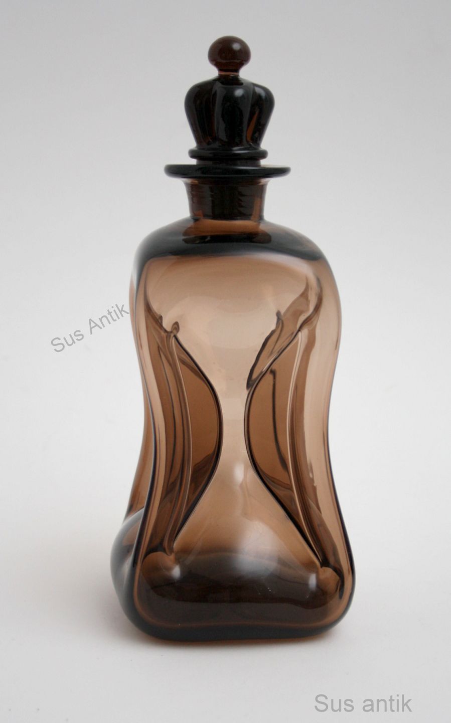 Holmegaard, Viol kluk kluk karaffel med kongekrone prop, røgtopas farve. Designet af Jacob E Bang i 1930'erne. Højde 25 cm. Flot stand. Pris: SOLGT