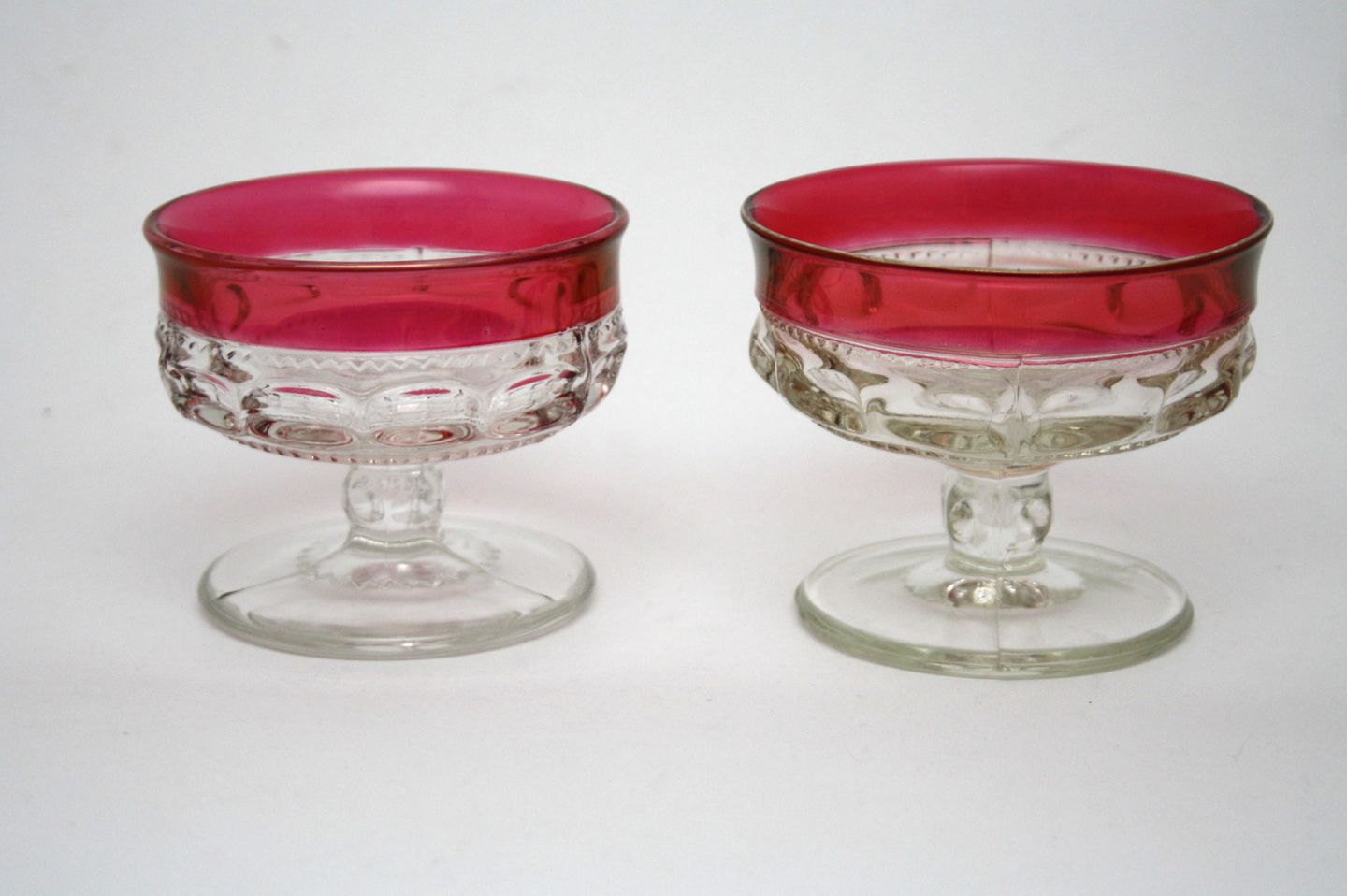 Amerikanske presset glas med rød lustrekant. Cocktailglas. Højde 7,5 cm. Diameter 9 cm. Pris: SOLGT Cocktailglas. Højde 8 cm. Diameter 9,5 cm. Pris: SOLGT Punchkop. Højde 9 cm. Diameter 8,5 cm. Pris: 100 kr. stk. Lager: 2