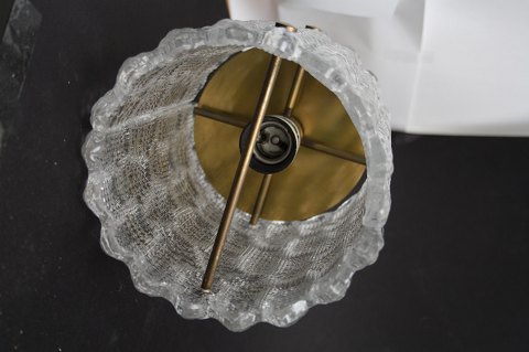 Orrefors loftlampe. Glasset er i 2 dele og har en højde på 25 cm. Højde incl. messing ophæng 58 cm. Pris: SOLGT