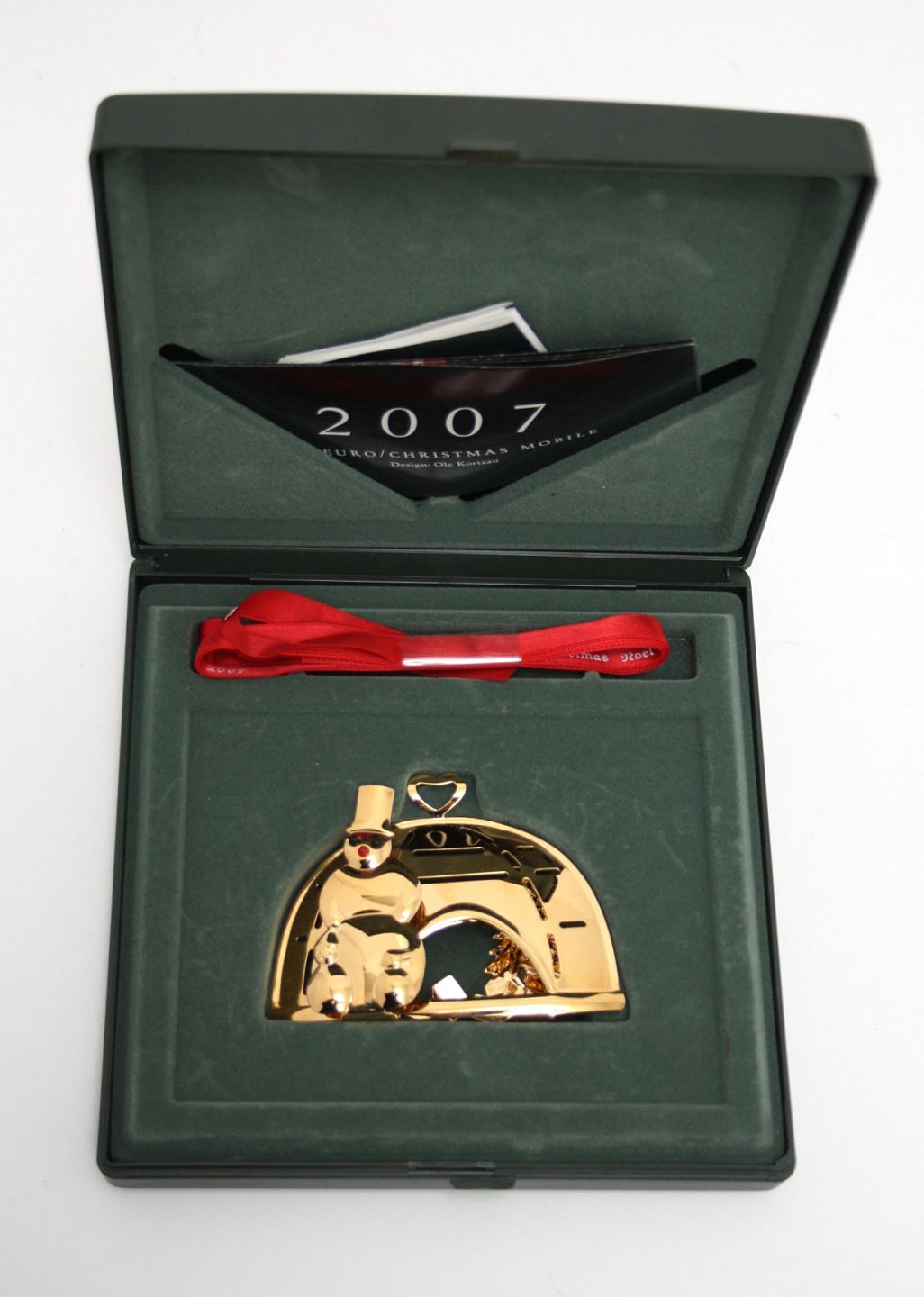 Georg Jensen, juleuro 2007 Jul i Grønland designet af kunstner Ole Kortzau. Juleuroen er udført i messing belagt med 24 karat guld. Originalt rødt silkebånd og gaveæske medfølger. Pæn og velholdt stand. Pris: 450 kr. stk. Lager: 2