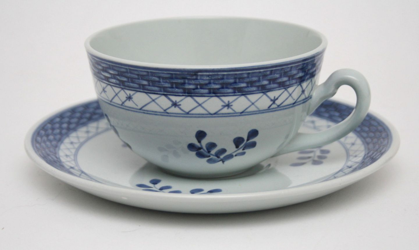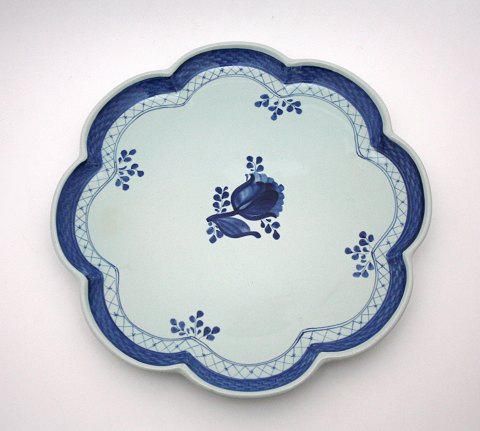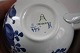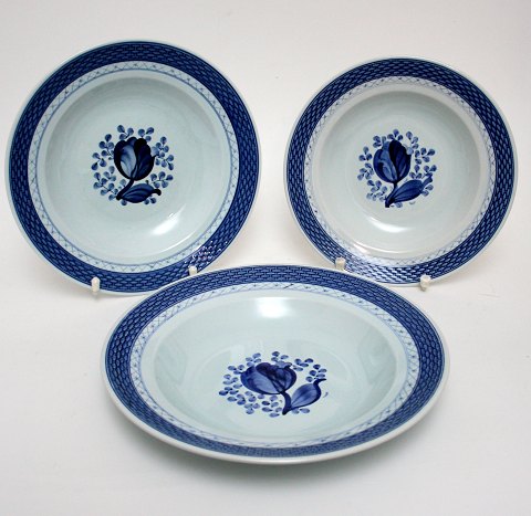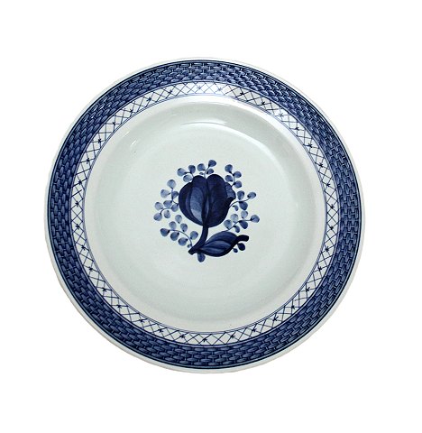 Aluminia, Tranquebar lyseblå fajance med mørkeblå tulipan og flettet bort designet af Christian Joachim. Produceret fra 1914 til 1969, hvor det overgik til Royal Copenhagen. Håndmalet.