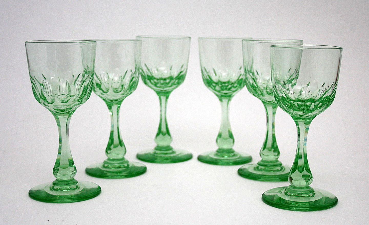 Holmegaard med flere, Edward er et Derby glas med høj kumme. Oliveslebet kumme, facetslebet stilk, rundslebet i bunden. Edvard optræder første gang i Holmegaards kataloget i 1900. Fantastisk smukke grønne vinglas. Højde 12,5 cm. Pris: SOLGT