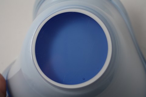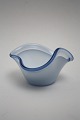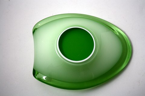 Lysegrønt fad med hvid opaline. Længde 19cm. Bredde 15 cm. Højde 7 cm. Pris: 375 kr. Lyseblå skål med hvid opaline. 18 x 16 cm. Højde 11 cm. Pris: 325 kr.