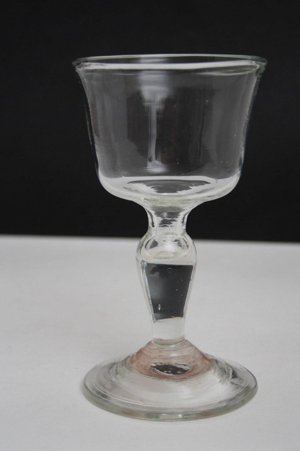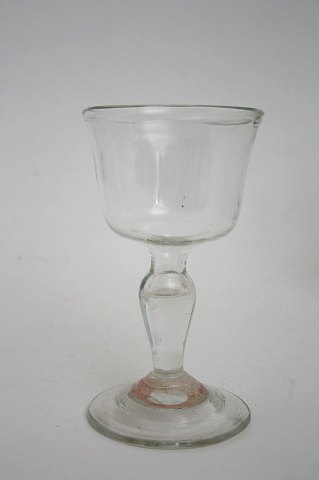 Vinglas med kumme der går halvt ned i stilken. Højde 14,3 cm. Diameter 8cm. Tykt glas. Pris: SOLGT
