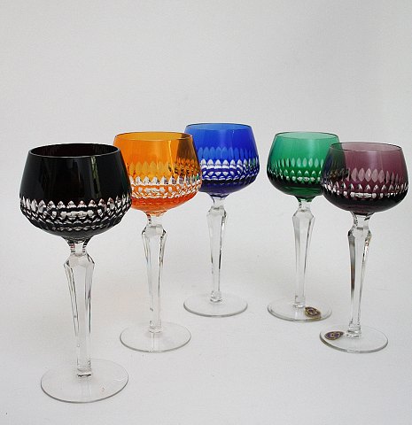 Bøhmisk krystal, vinglas i flere farver. Højde 19,5 cm. Øverste diameter 6,5 cm. Pris: SOLGT Bordeaux. Lager: SOLGT Gul. Lager: 1 Rød. Lager: SOLGT Blå. Lager: 1SOLGT Grøn. Lager: SOLGT Aubergine. Lager: SOLGT Mørklilla. Lager: SOLGT