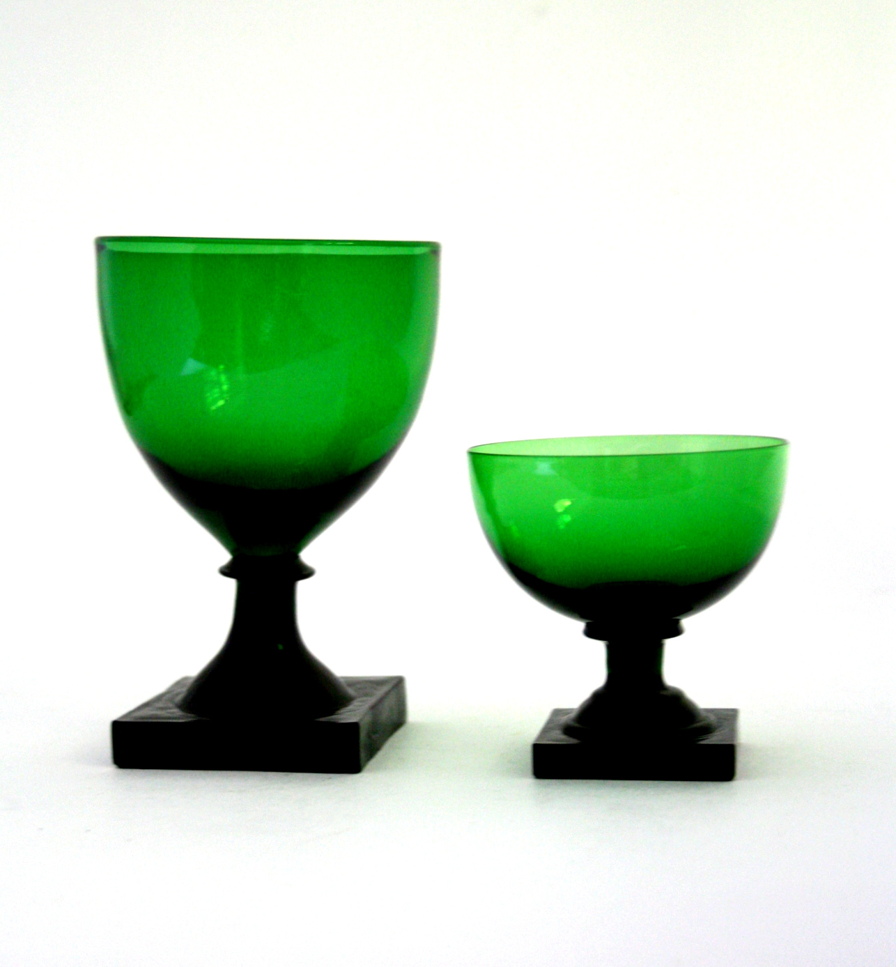 Holmegaard Gorm den Gamle i mørkegrøn glas med kraftig firkantet fod. I bunden en blomst med runde kronblade. Fremstillet fra 1920.