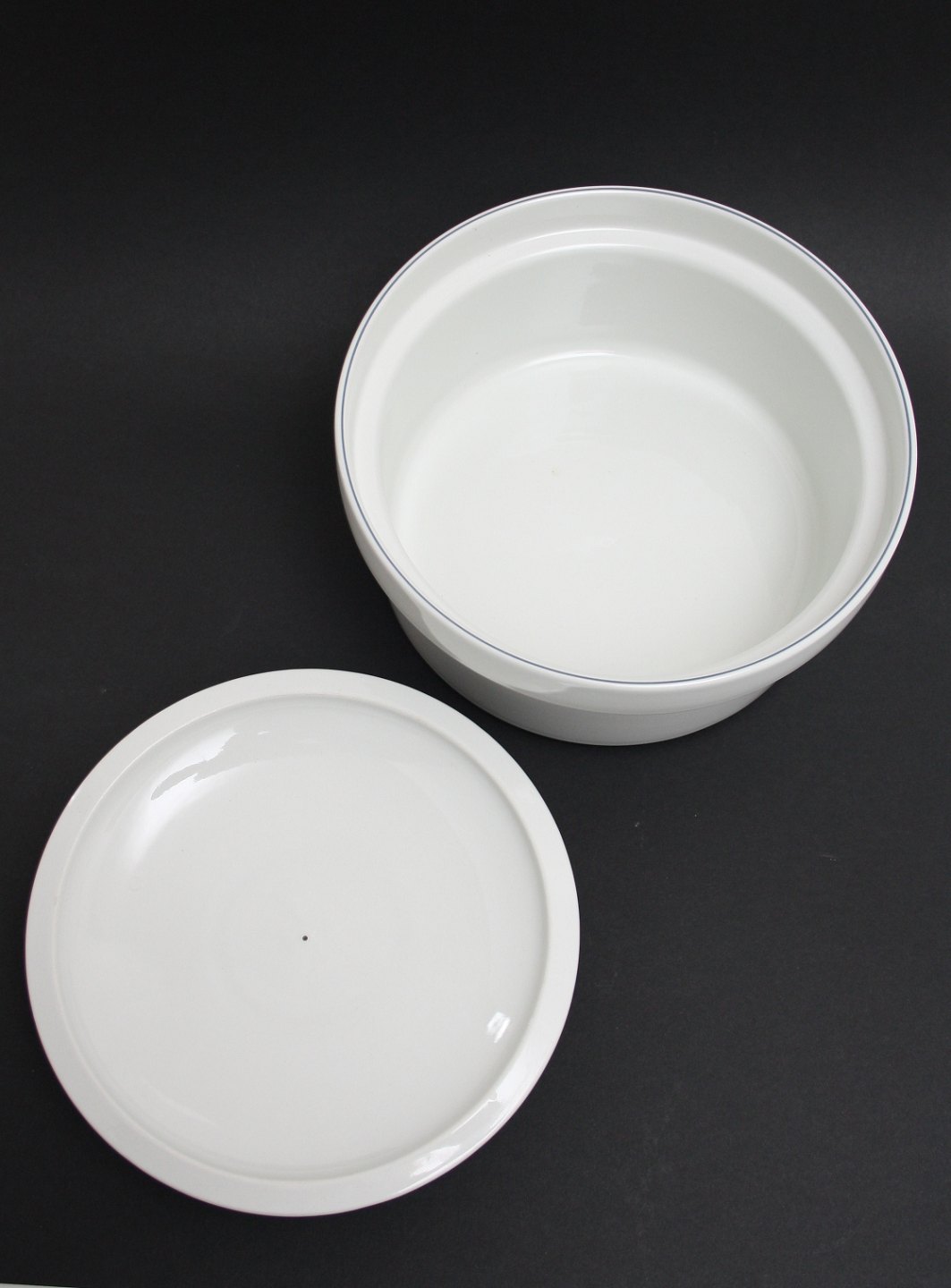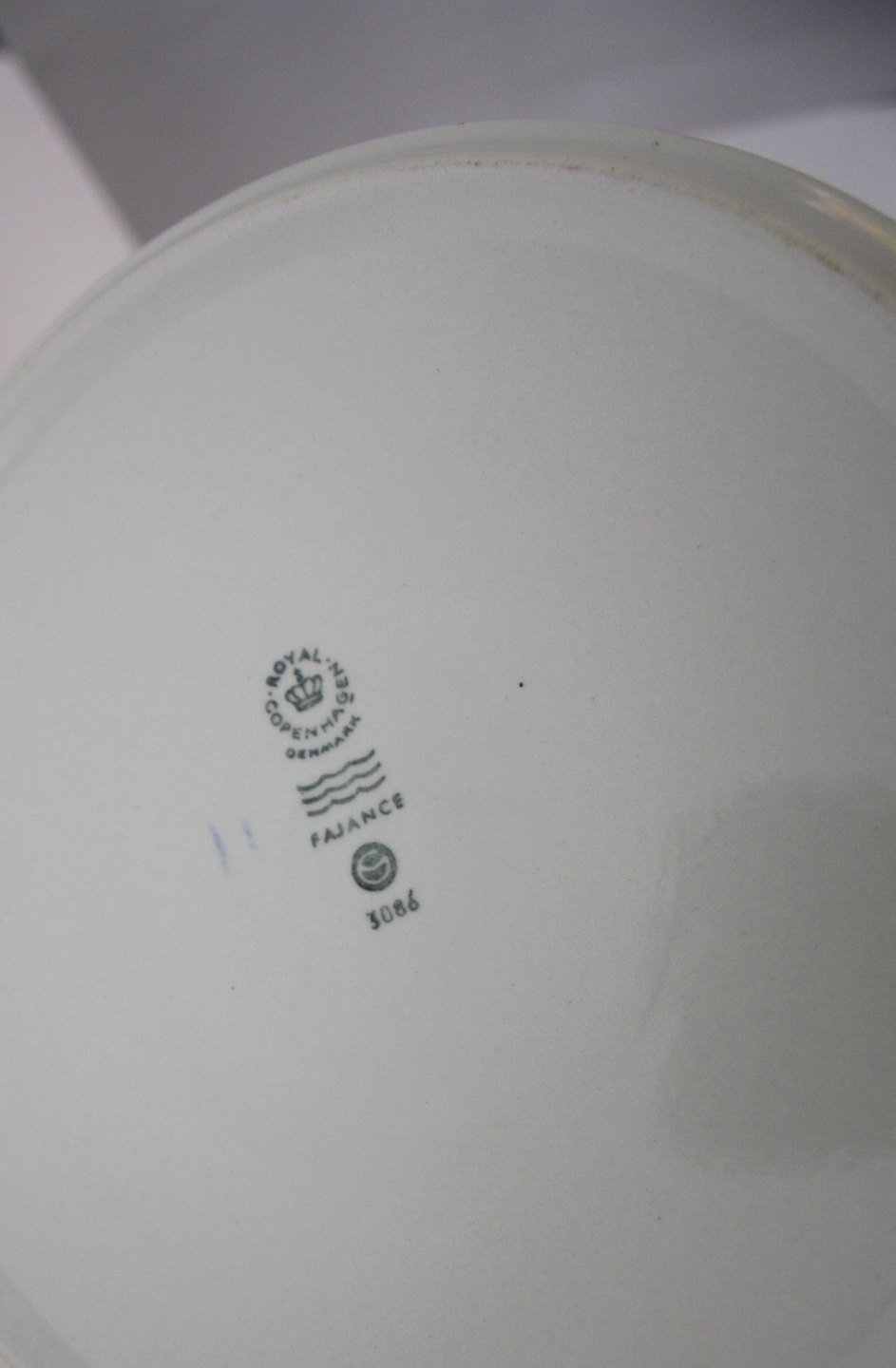 Royal Copenhagen fajance, Blåkant. Designet af Grethe Meyer i 1965. Terrin med låg. Nr. 3086. Højde med låg 13,5 cm. Diameter 20,5 cm. II. sortering. Fin stand. Pris: SOLGT