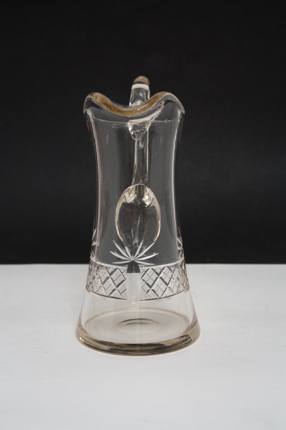 Glaskande med krydsslibninger rundslebet i bund. Højde 20,5 cm. Afslag ved hank. Pris: 225 kr.