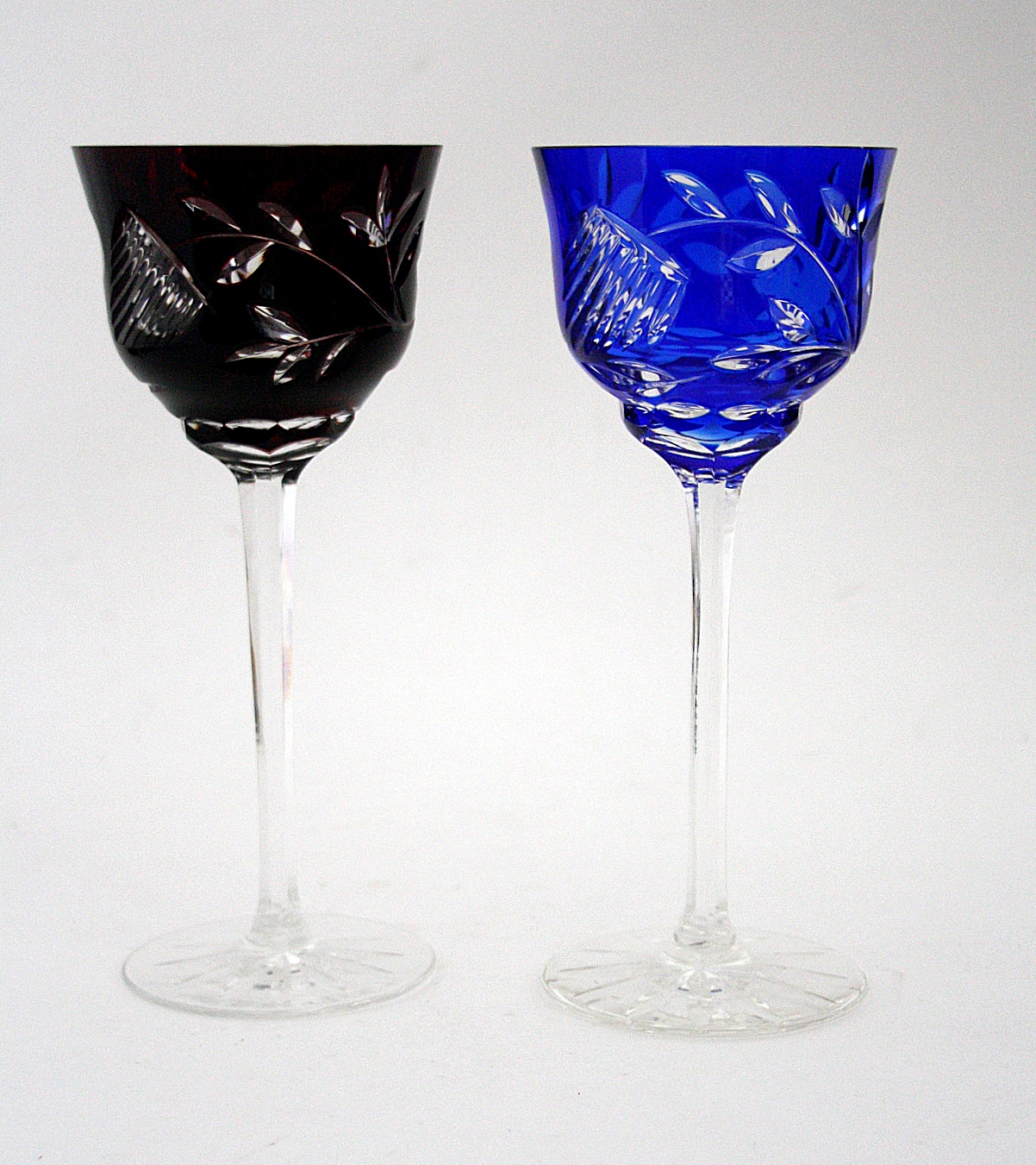 Bøhmisk krystal, vinglas slibninger kumme, stilk og fod. Højde 19 cm. Pris: 225 kr. stk. Aubergine. Lager: SOLGT Blå. Lager: 1