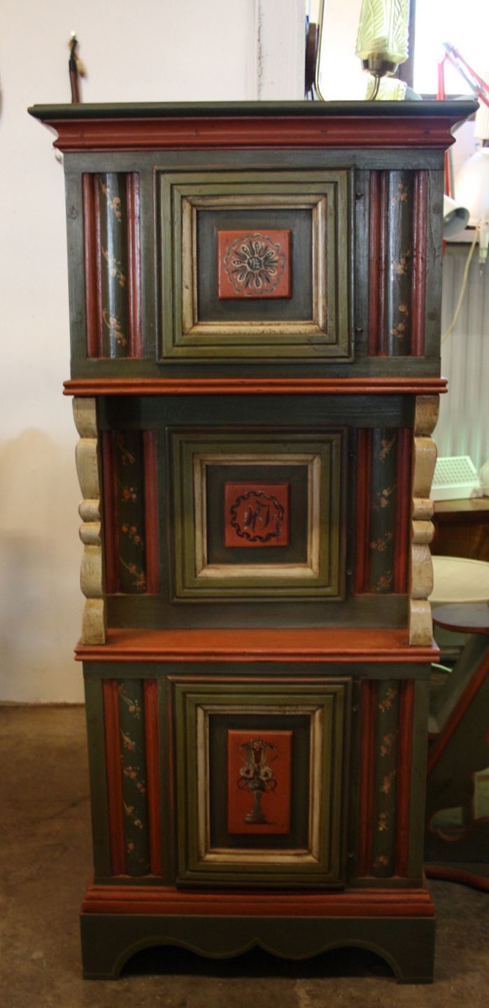 3 delt stolpe/søjleskab i almuebemalet fyr. Højde 122 cm. Bredde 55 cm. Dybde 27 cm. 2 hylder i øverste del. Pris: SOLGT