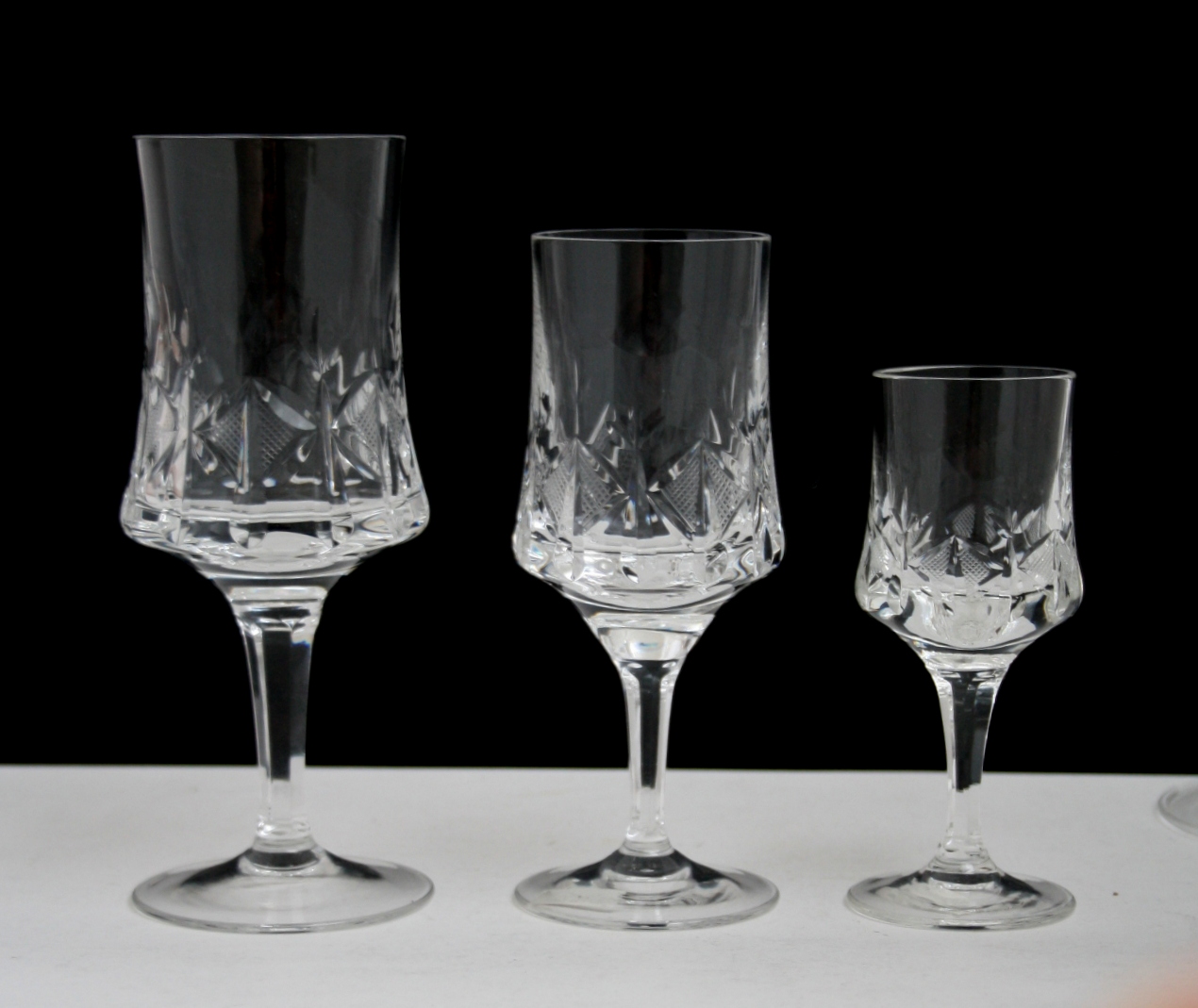 Prag, Lyngby glasværk. Hvidvin. Højde 17 cm. Pris: 125 kr. stk. Lager: 12 Portvin. Højde 15 cm. Pris: 75 kr. stk. Lager: 10 Snaps. Højde 12 cm. Pris: 60 kr. stk. Lager: 6