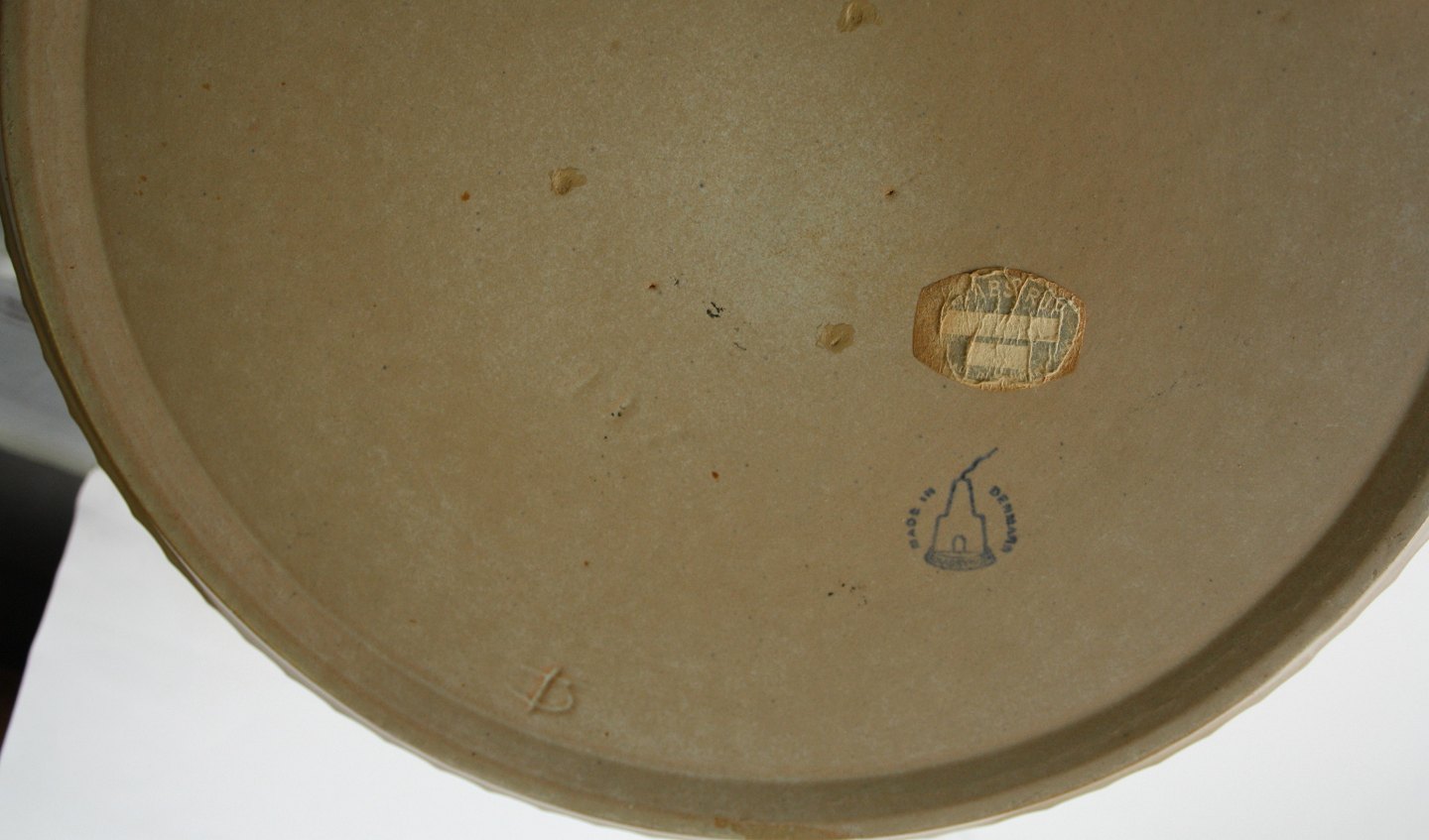 Knabstrup, Stort rundt fad i douche farver lys blå og beige designet af Günter Praschak ca 1967. Diameter 28 cm. Højde 5 cm. Flot stand. Pris: SOLGT