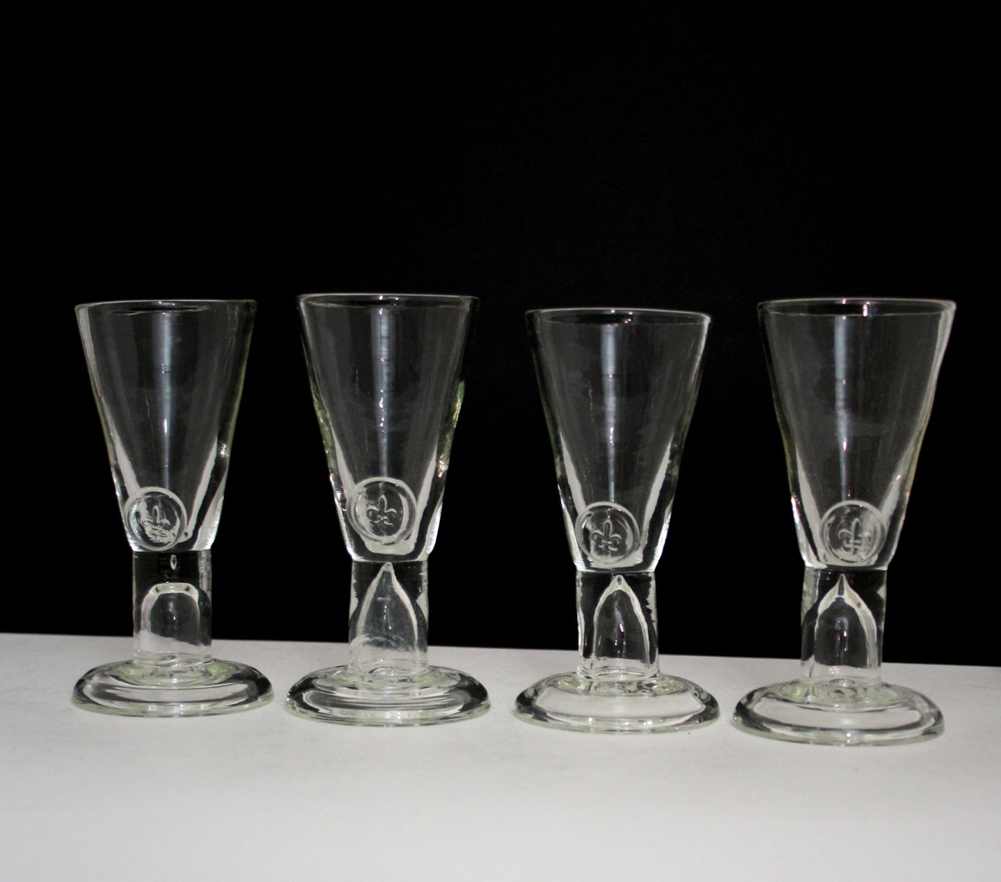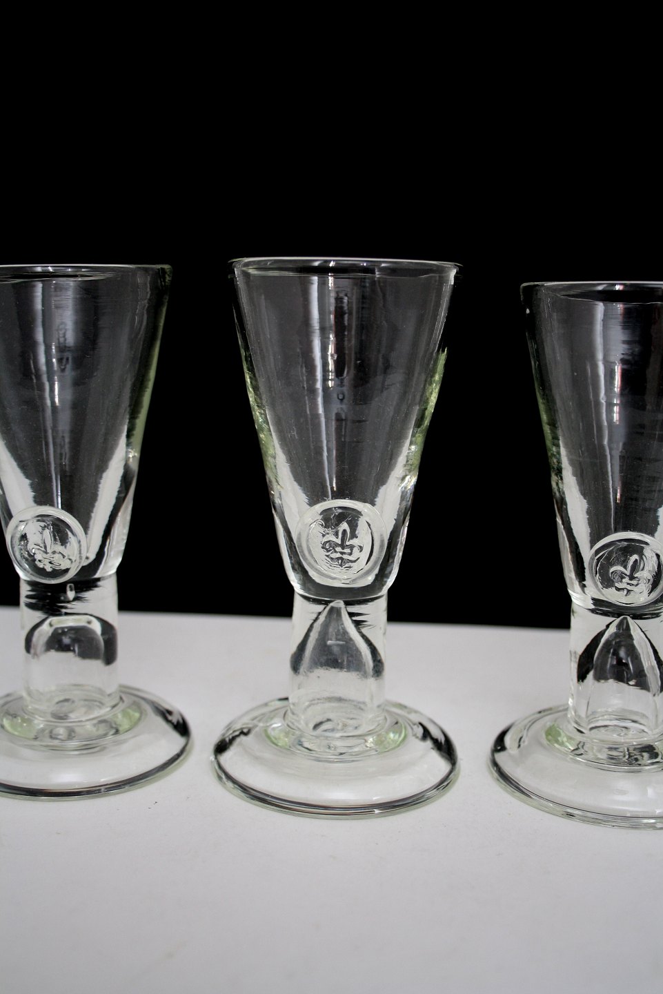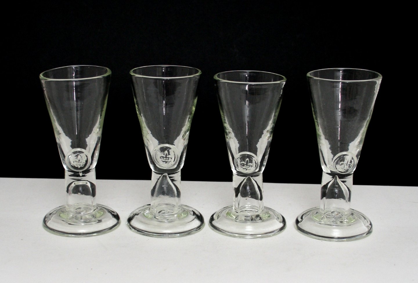 Rakkerglas med fransk lilje, 1900 tallet, Højde ca. 13 cm. Øverste diameter ca 5,5 cm. Pris 200 kr. stk. Lager: 2