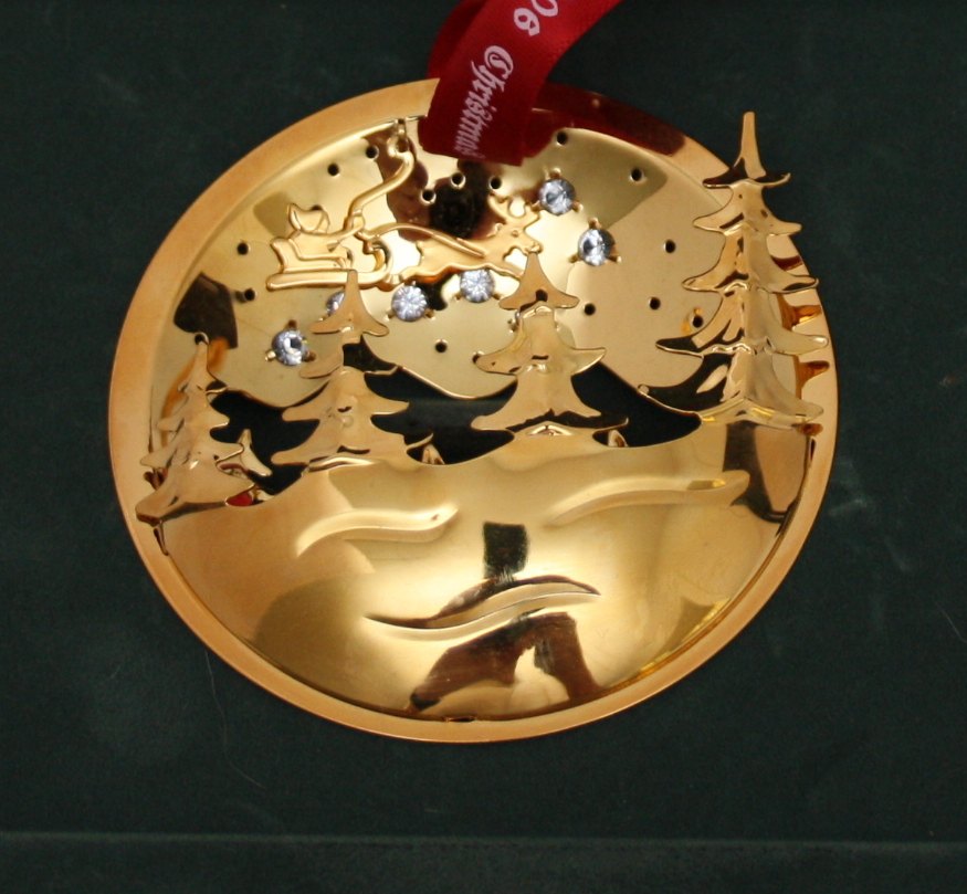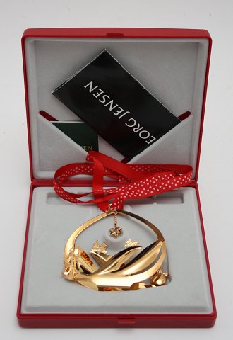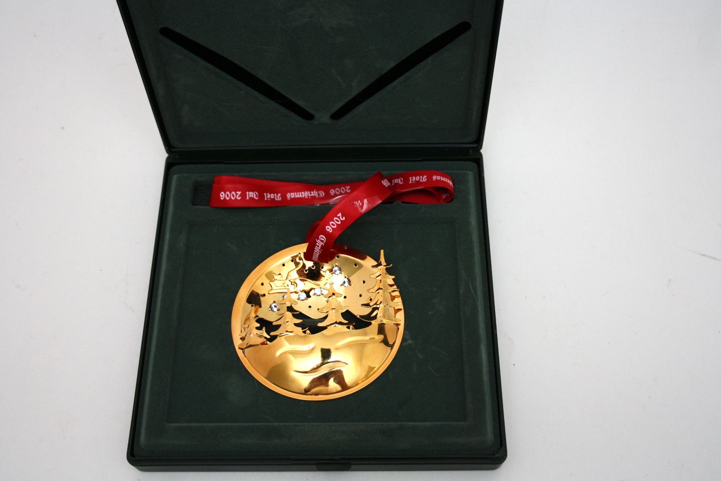 Georg Jensen, juleuro 2006 Vinternat designet af kunstner John Mortensen. Juleuroen er udført i messing belagt med 24 karat guld. Originalt rødt silkebånd og gaveæske medfølger. Pæn og velholdt stand. Pris: 400 kr. stk. Lager: 5
