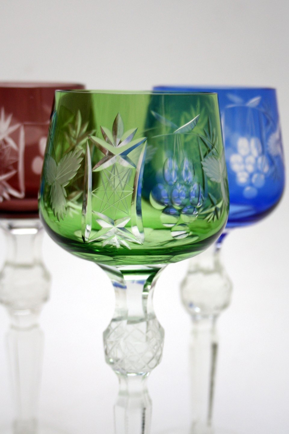 Bøhmisk krystal, Vinglas i flere farver. Kumme med druer, blade og stjerner. Slebet stilk. Højde 21,5 cm. Pris: 250 kr. stk.