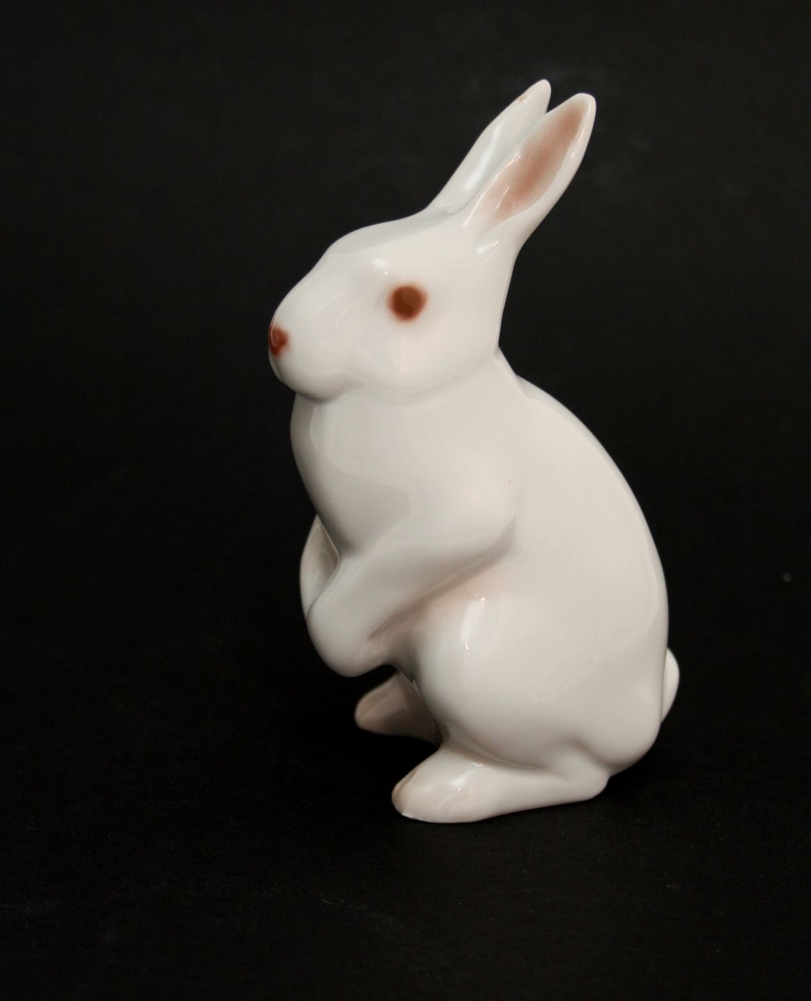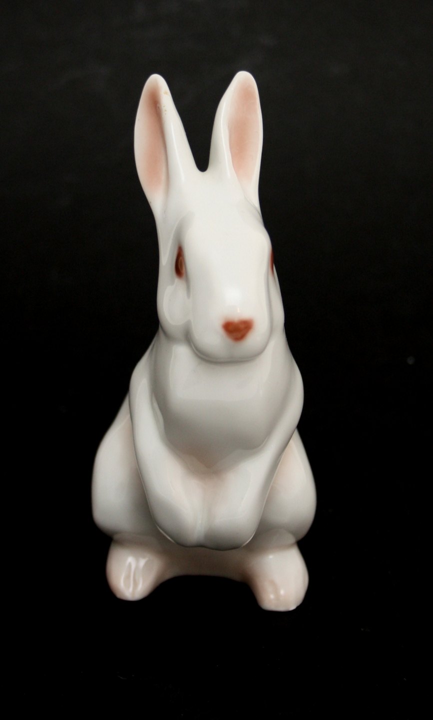 Royal Copenhagen, Kanin siddende på bagben. Designet af K. Otto. Nr. 2443. Stemplet med gammel krone mærke. Højde 13 cm. II. sortering. Pris: SOLGT