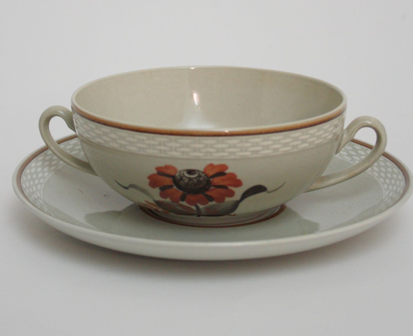 Boulionkop med ører og undertallerken. Formnr. 1633. Højde på kop 5,5 cm. Diameter uden ører 13 cm. Undertallerken diameter 19 cm. Pris: 175 kr. Stk. Lager: 3