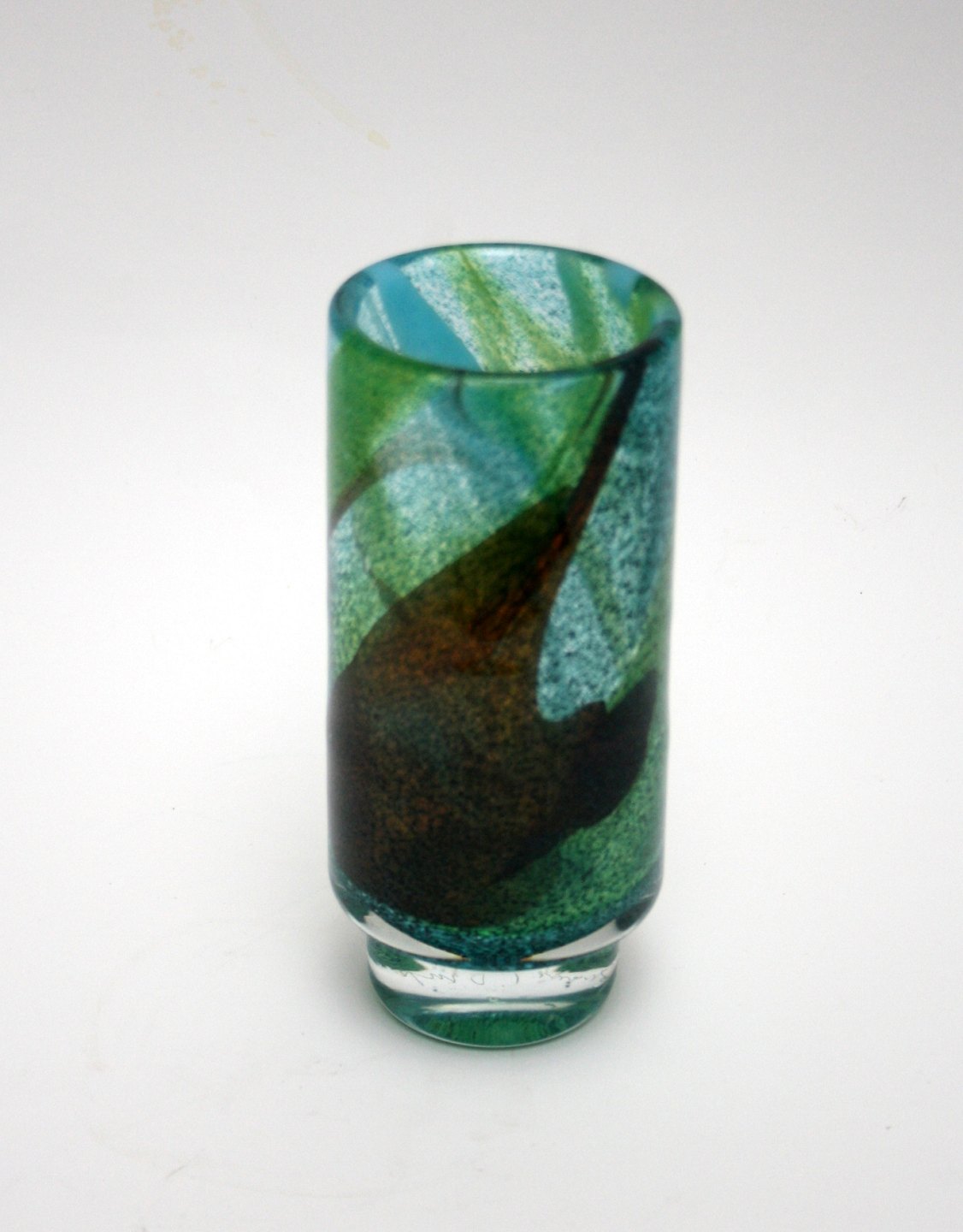Johansfors glasværk, Sverige, Cylinderforvet vase på fod fra serien Spontana designet af Bengt Orup 1967, signeret Orup Johansfors. Højde 18,5 cm. Fin og hel stand. Pris: SOLGT