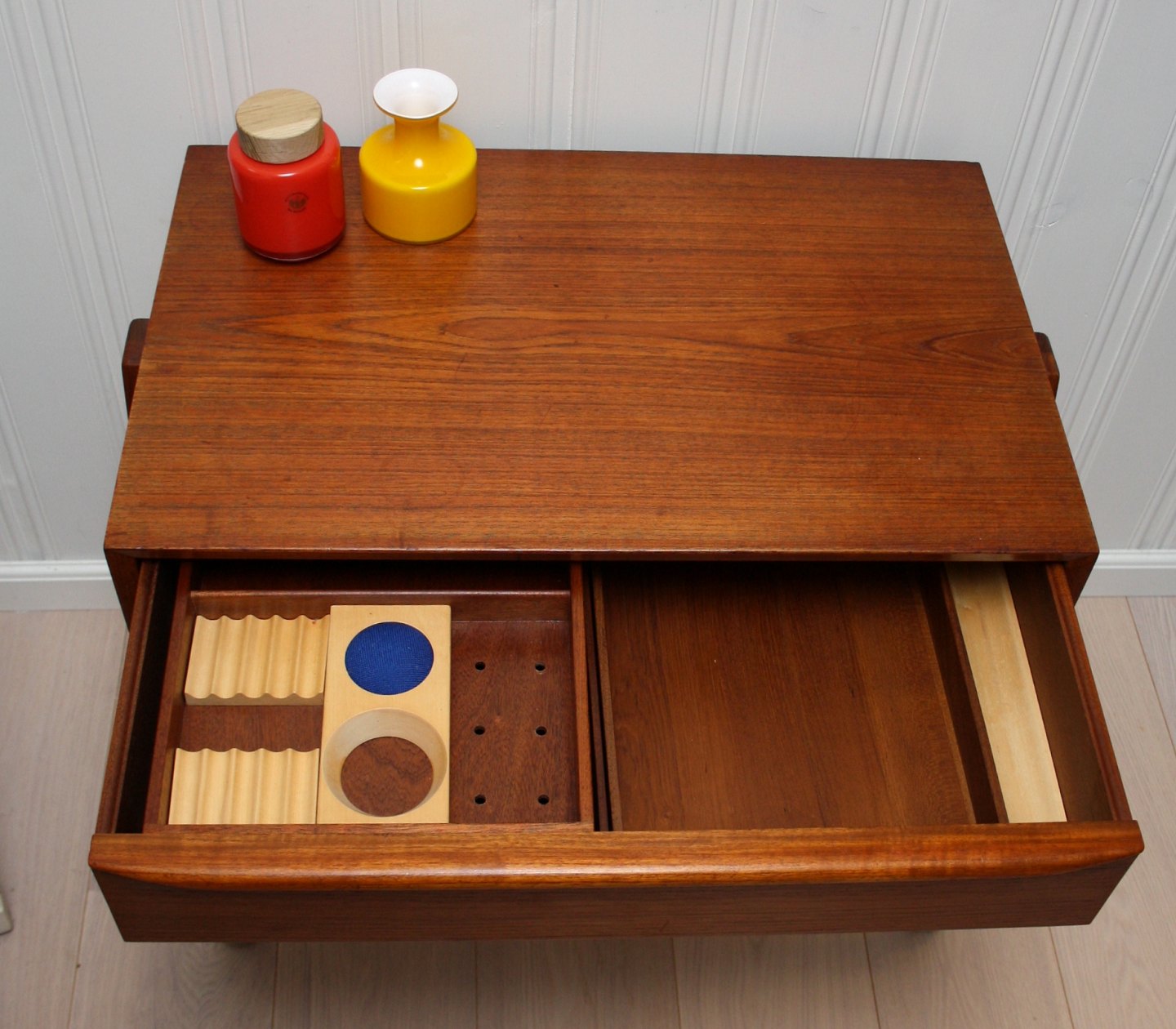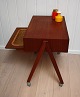 Sybord af teak, front med skuffe og udtræksskuffe med garnkurv af flet, på skråtstillede ben. H. 61,5 cm. B. 65 cm. D. 42 cm. Fremstår med enkelte mærker Pris: SOLGT