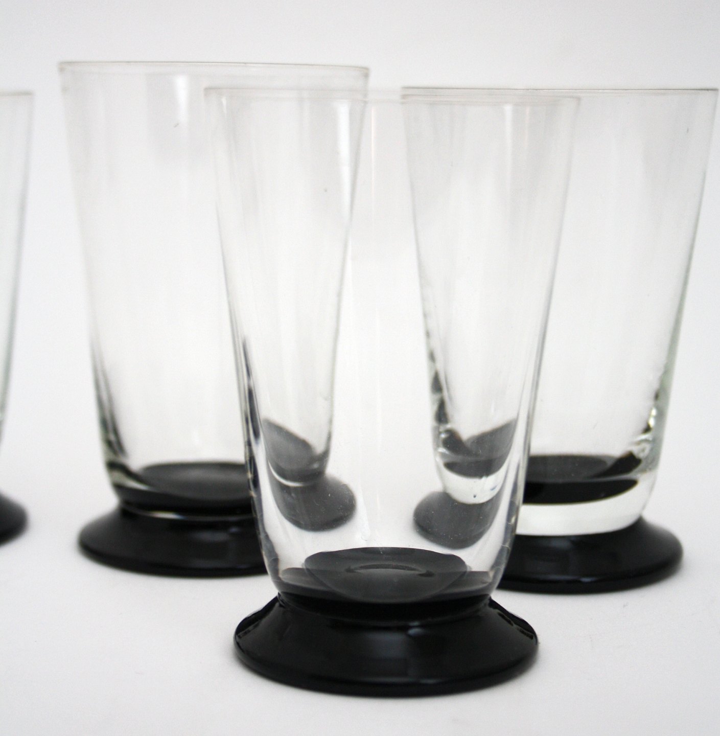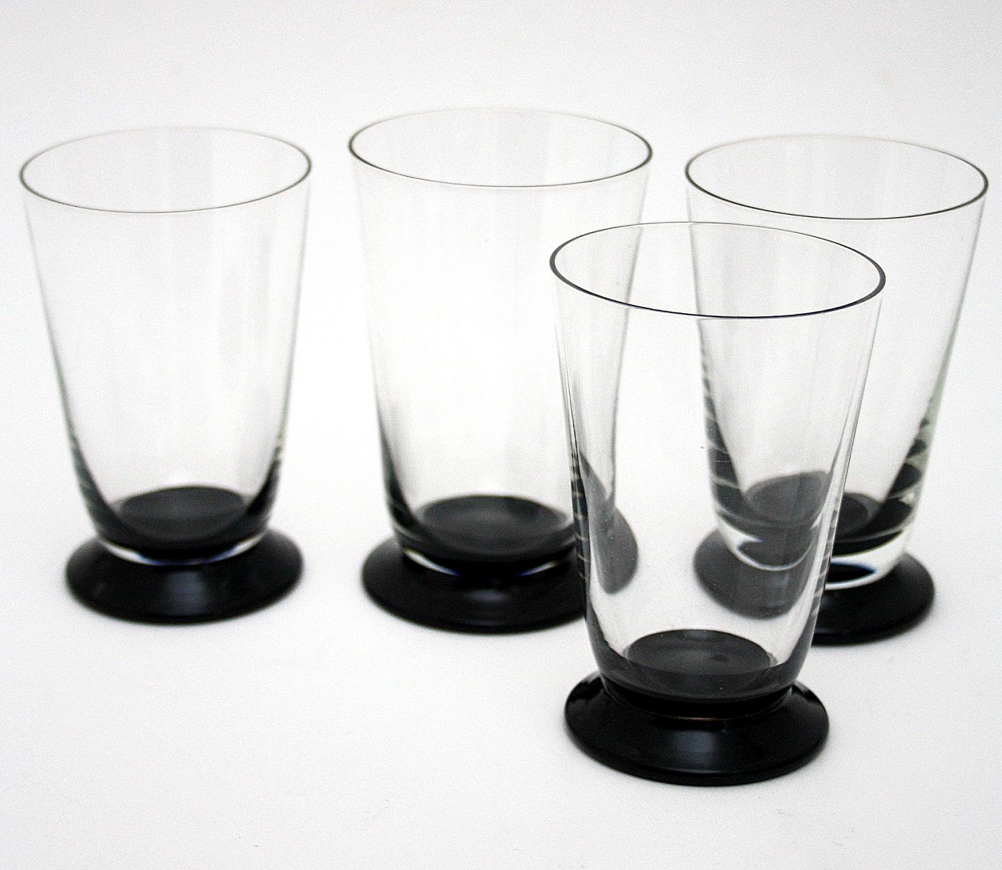 Sodavandsglas med sort fod. Højde 8,5 cm. Øverste diameter 5,7 cm. Pris: 60 kr. stk. Lager: 7