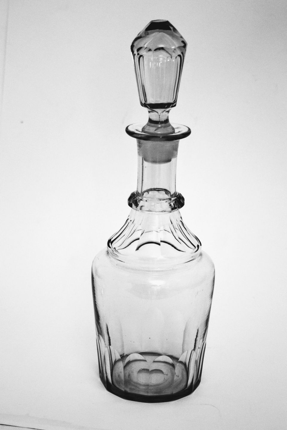Karaffel med slebet bånd på hals, med olivslibninger nederst og rundslebet i bunden. Rosa skær. Højde med prop 27 cm. Pris: SOLGT