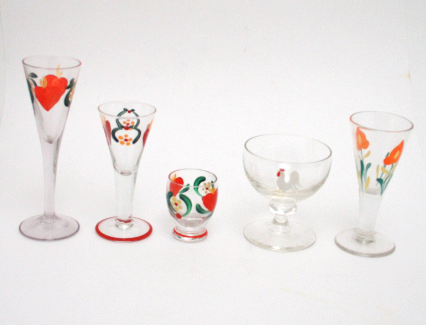 Holmegaard, Emaljebemalede glas, designet af Jacob E Bang. Fra malerstuen i Nyhavn fra 1937-1957. Enkelte af dem kan være svenske.