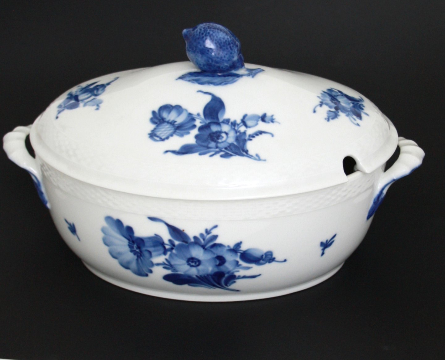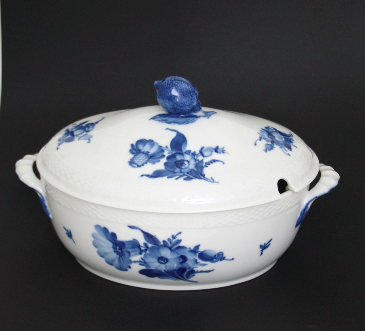Royal Copenhagen, Blå Blomst flettet, Oval suppeterrin med låg. Nr. 10/8172. Højde 20,5 cm. Længde 31,5 cm. Bredde 19 cm. II. sortering. Pris: 2.500 kr. stk. Lager: 2