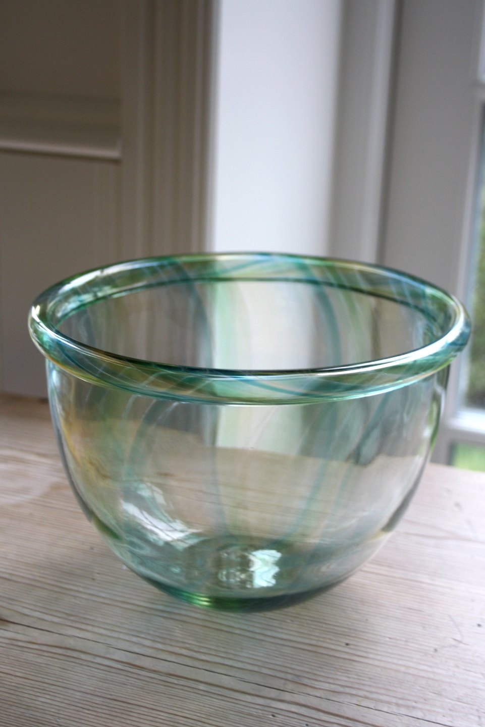 Lena Ljungar, Glasmagerne eget værksted Tåsinge sammen med Jesper Sødring. Skål i grønne nuancer. Signeret Lena Ljungar 2001. Diameter 20 cm. Højde 14,5 cm. Pris: SOLGT