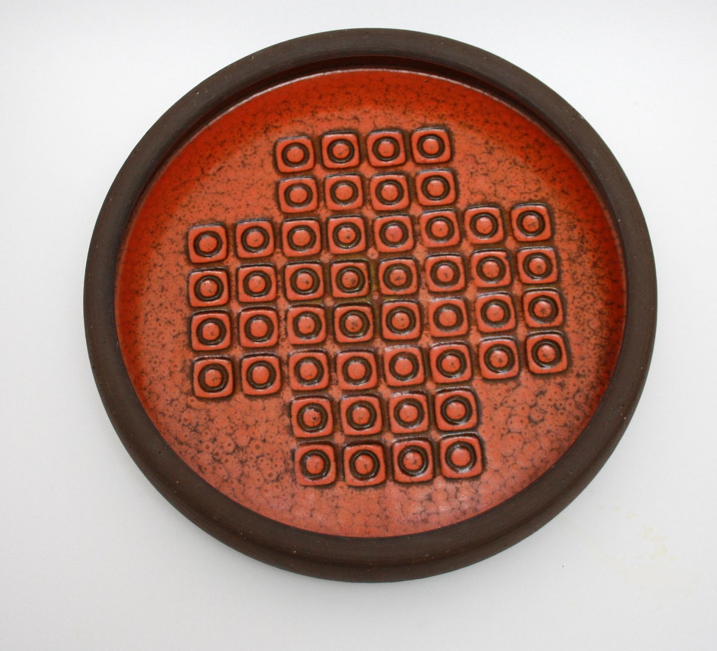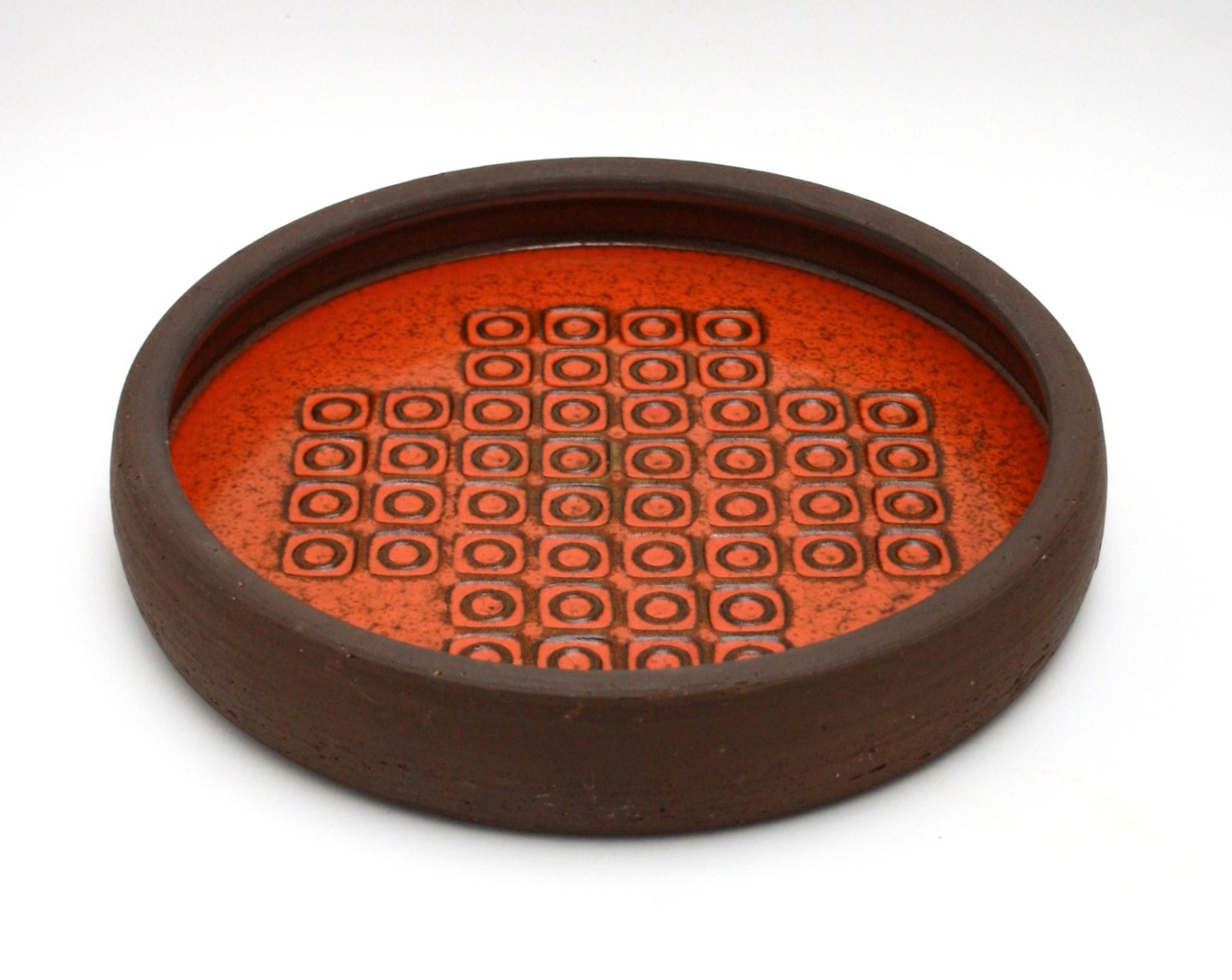 Nysted keramik, Fad med orange glasur indvendig. Fra 1970'erne. Diameter 27 cm. Højde 4,5 cm. Pris: 450 kr.