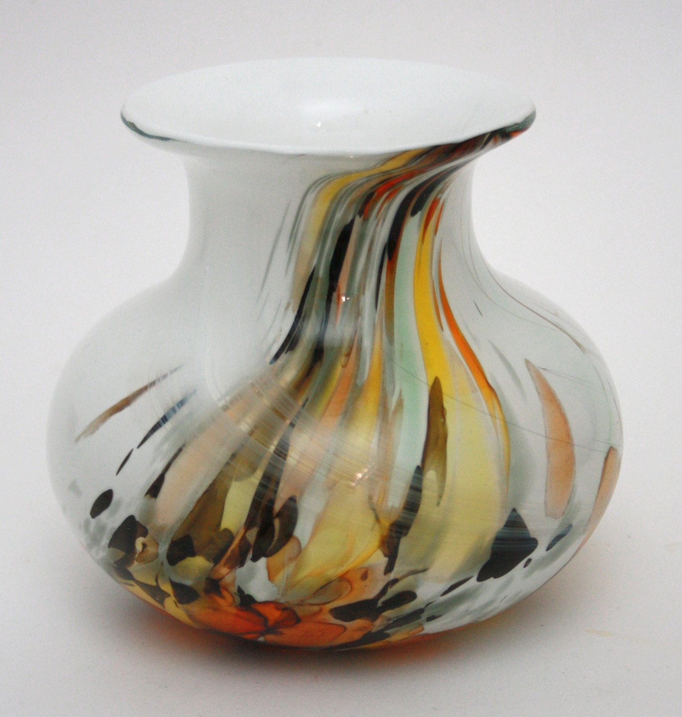 Holmegaard, Cascade vase designet af Per Lütken i 1970,erne. Mundblæst opalhvid glas med indlagte skår i forskellige farver. Signeret HG6.