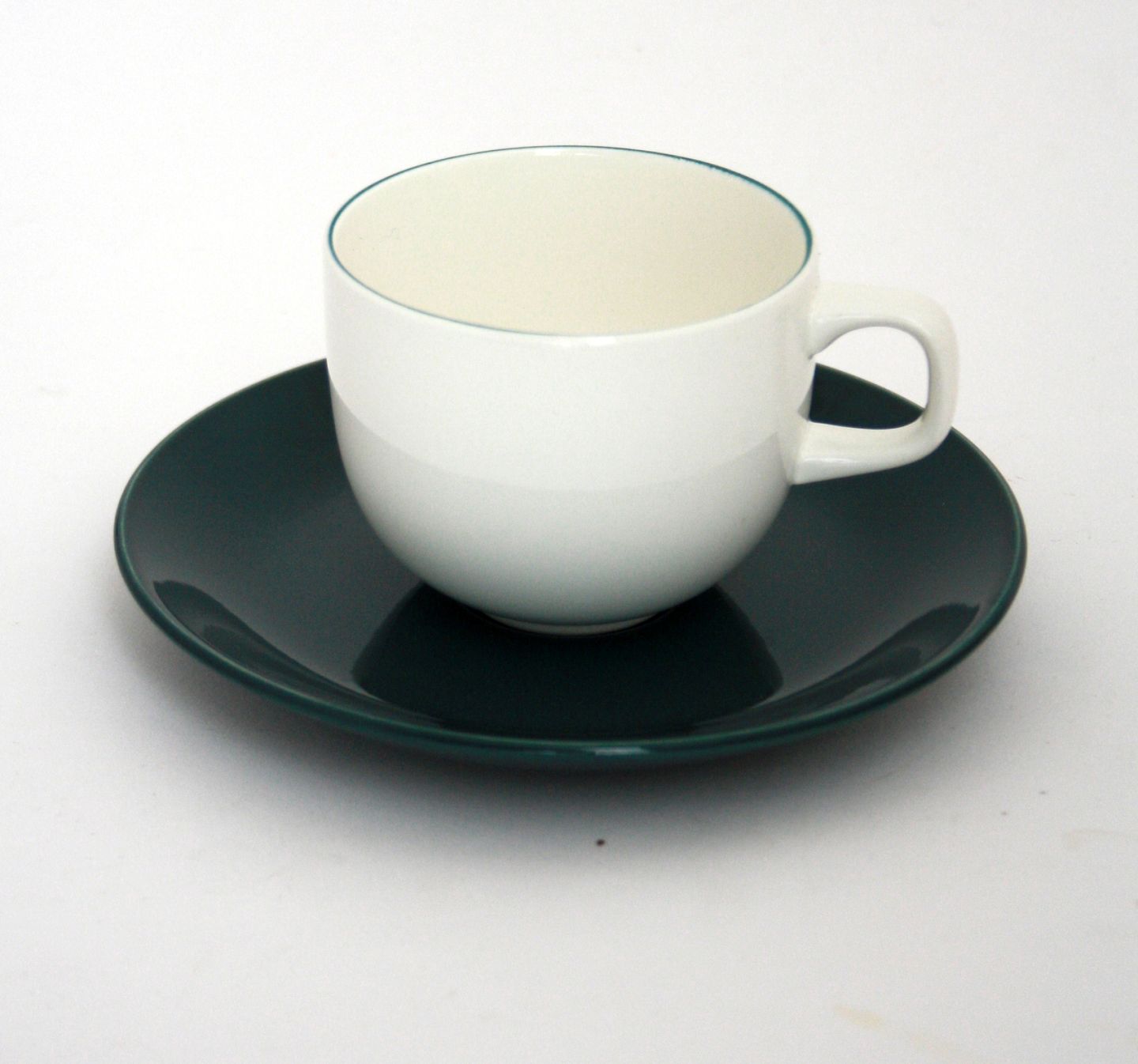 Royal Copenhagen, 4 All Seasons, Kaffekop med mørkegrøn kant og grøn underkop. Designet af Grethe Meyer. Nr. 072. Diameter 8 cm. Højde 6,5 cm. II. Sortering. Pris: SOLGT