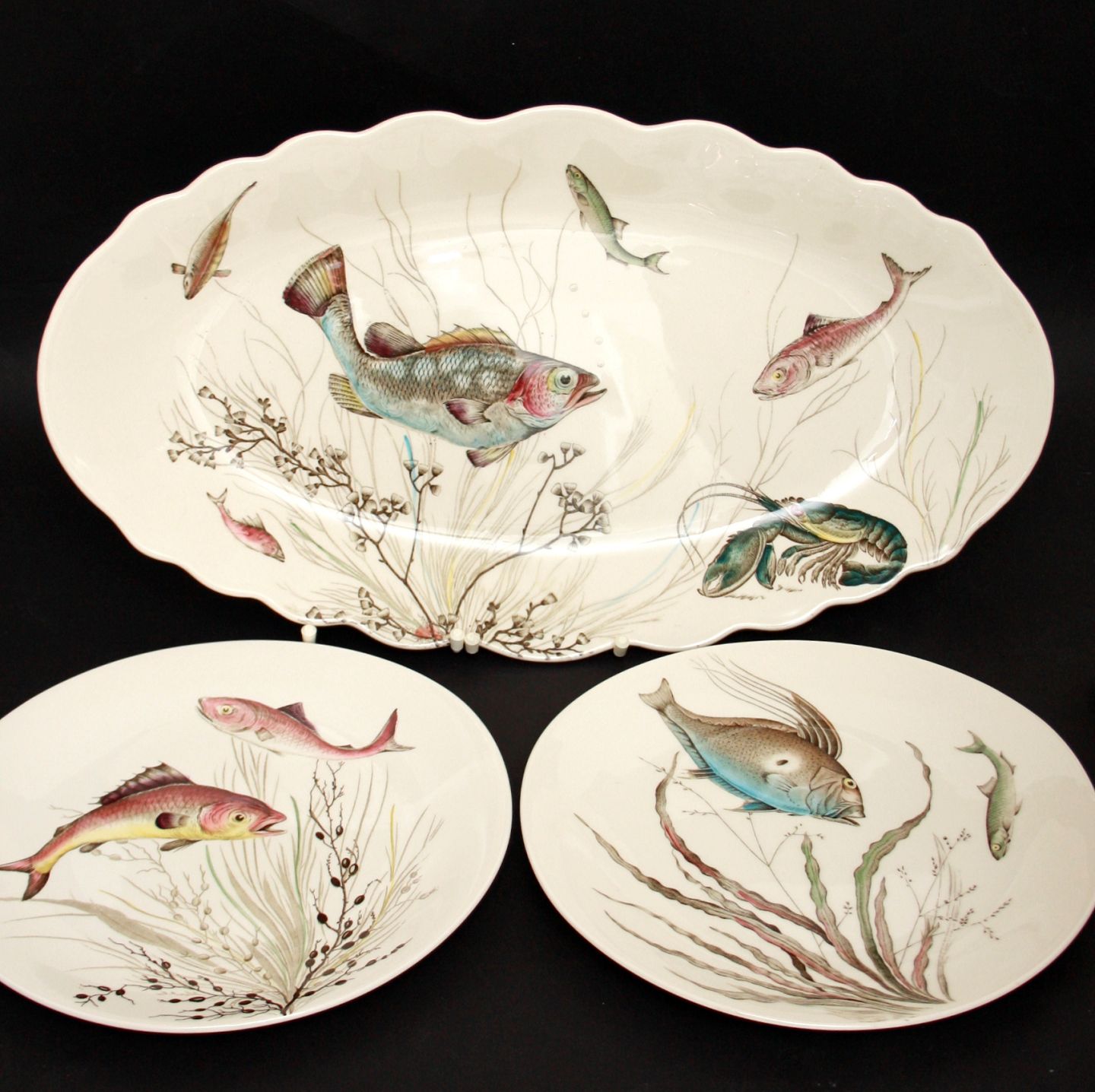 Tallerkener med forskellige fiske motiver. Mål 26 x 24 cm.