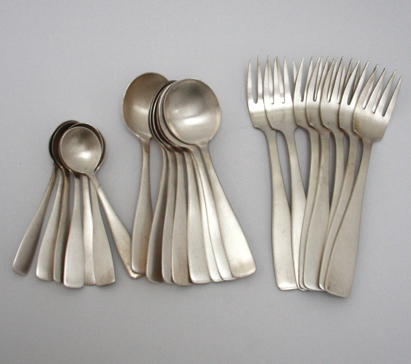 Stålbestik, Centa, Mærket DTA Nr. 36 med eneret for Bøgelund Jensen. Gaffel. Længde 17,5 cm. Pris: SOLGT Ske. Længde 15 cm. Pris: SOLGT Teske. Længde 12 cm. Pris: SOLGT