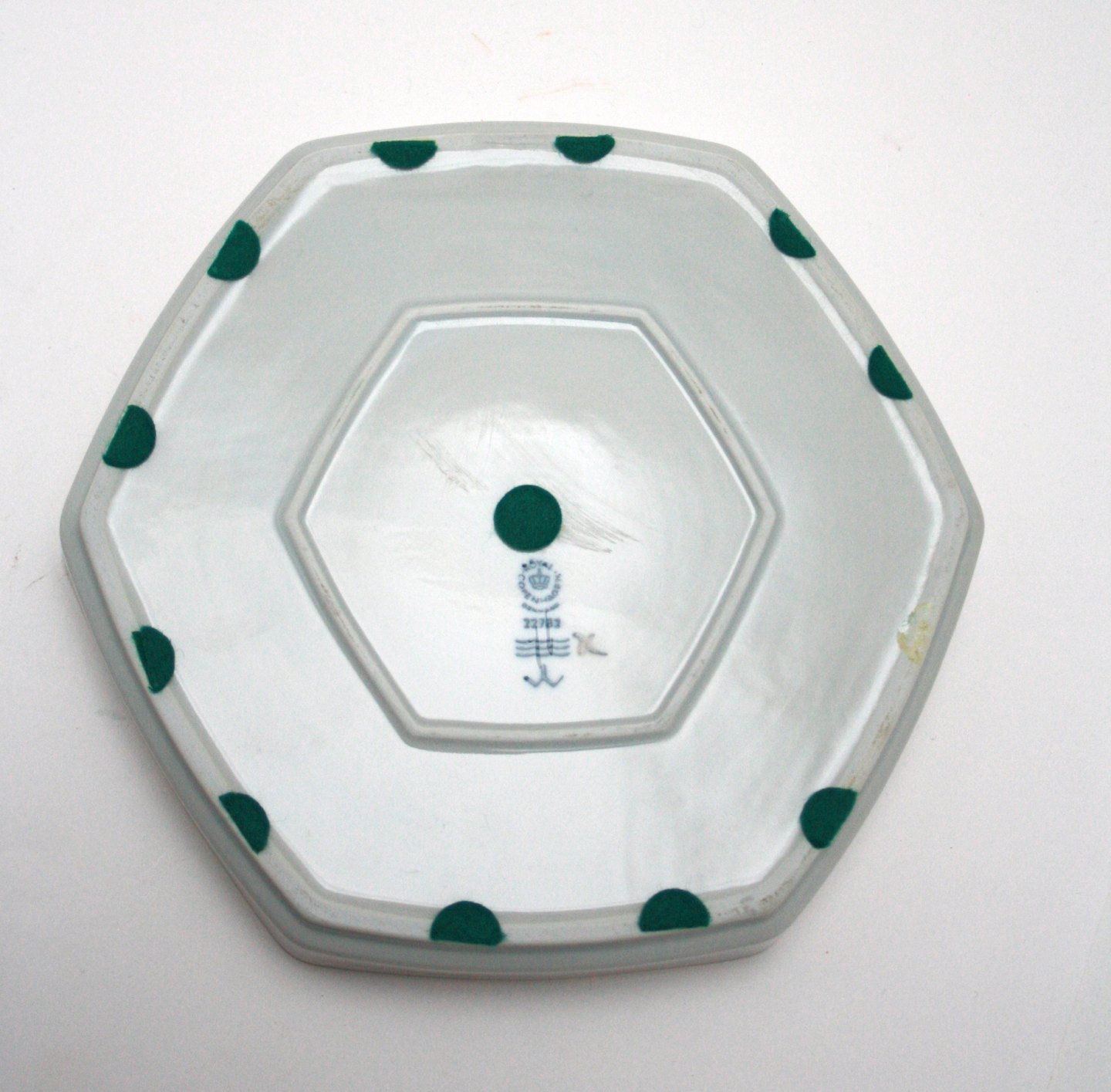 Royal Copenhagen, Sekskantet fad i serien Japanese Bamboo. Designet af Ivan Weiss. Formnr. 22782. 19,5 x 22 cm. Højde 3 cm. III. sortering. Pris: 350 kr. stk. Lager: 2