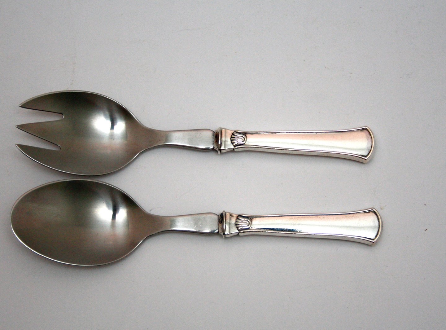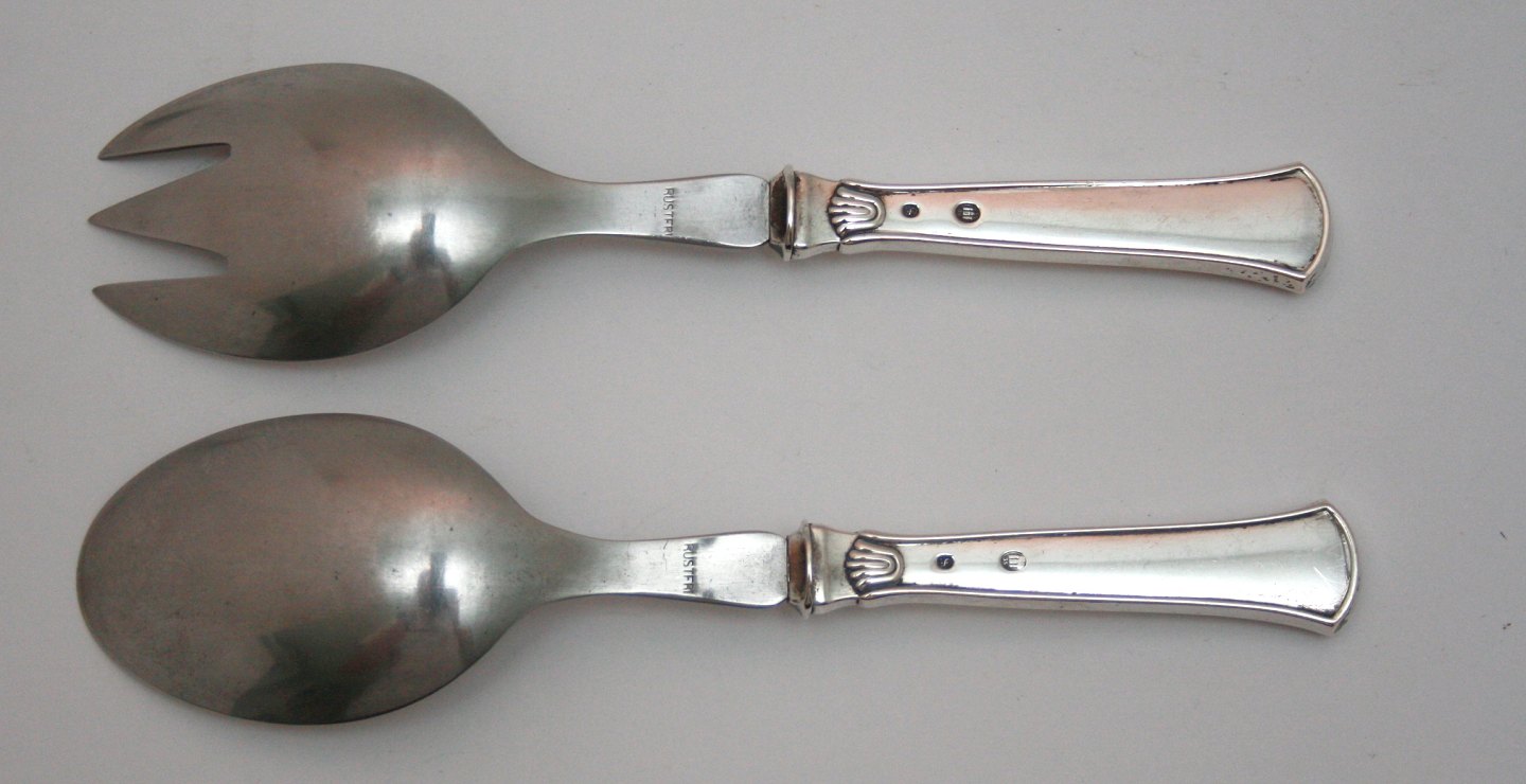 Arvesølv nr. 5, Salatbestik. Tretårnet sølv og rustfrit stål. Ske. Længde 17 cm. Gaffel. Længde 16,5 cm. Pris for sættet 650 kr.