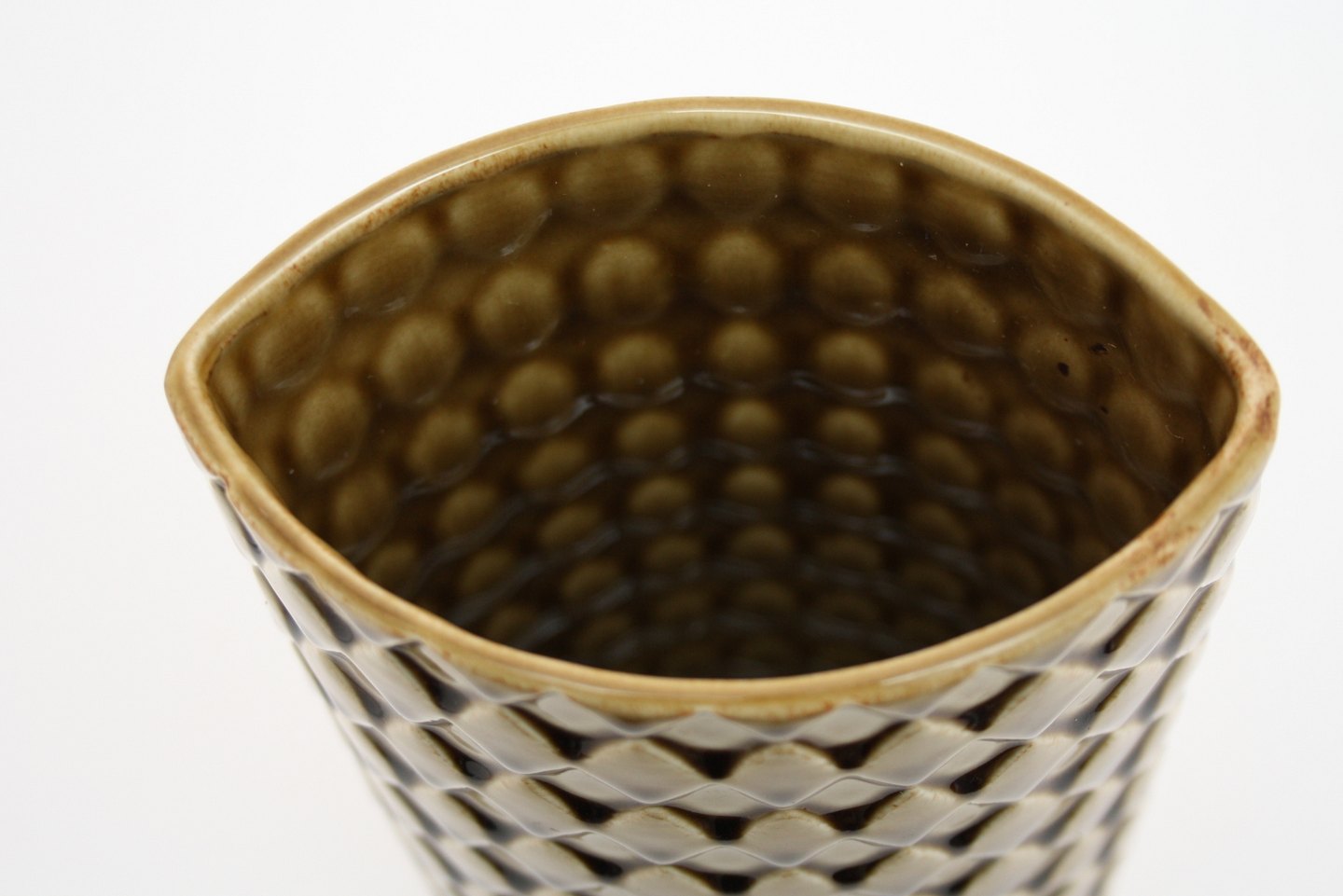Arabia, Finland, Harlekiini vase i sennepsgul glaseret porcelæn. Designet af Kaarina Aho i 1960'erne. Formnr. 379/4. Højde 21 cm. Længde 12 cm. Bredde 7,5 cm. Flot stand. Pris: solgt