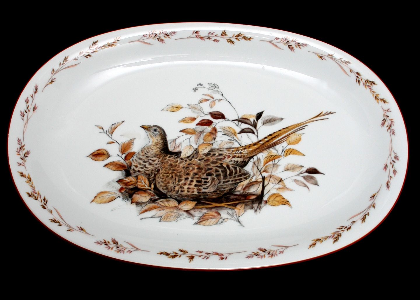 Jagtstellet designet af Mads Stage for Imerco. Ovalt stegefad med Fasan høne. Længde 38 cm. Bredde 24,5 cm. Pris: 575 kr. stk. Lager: 1