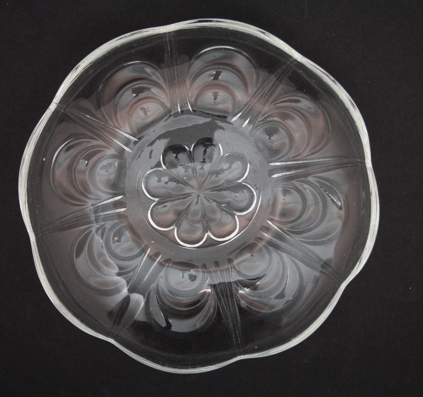 Fyens Glasværk/Kastrup Glasværk, Nanna. Klart presset glas fra 1934 og frem. Isassiet. Diameter 16 cm. Højde 2,5 cm. Pris: 40 kr. stk. Lager: 8
