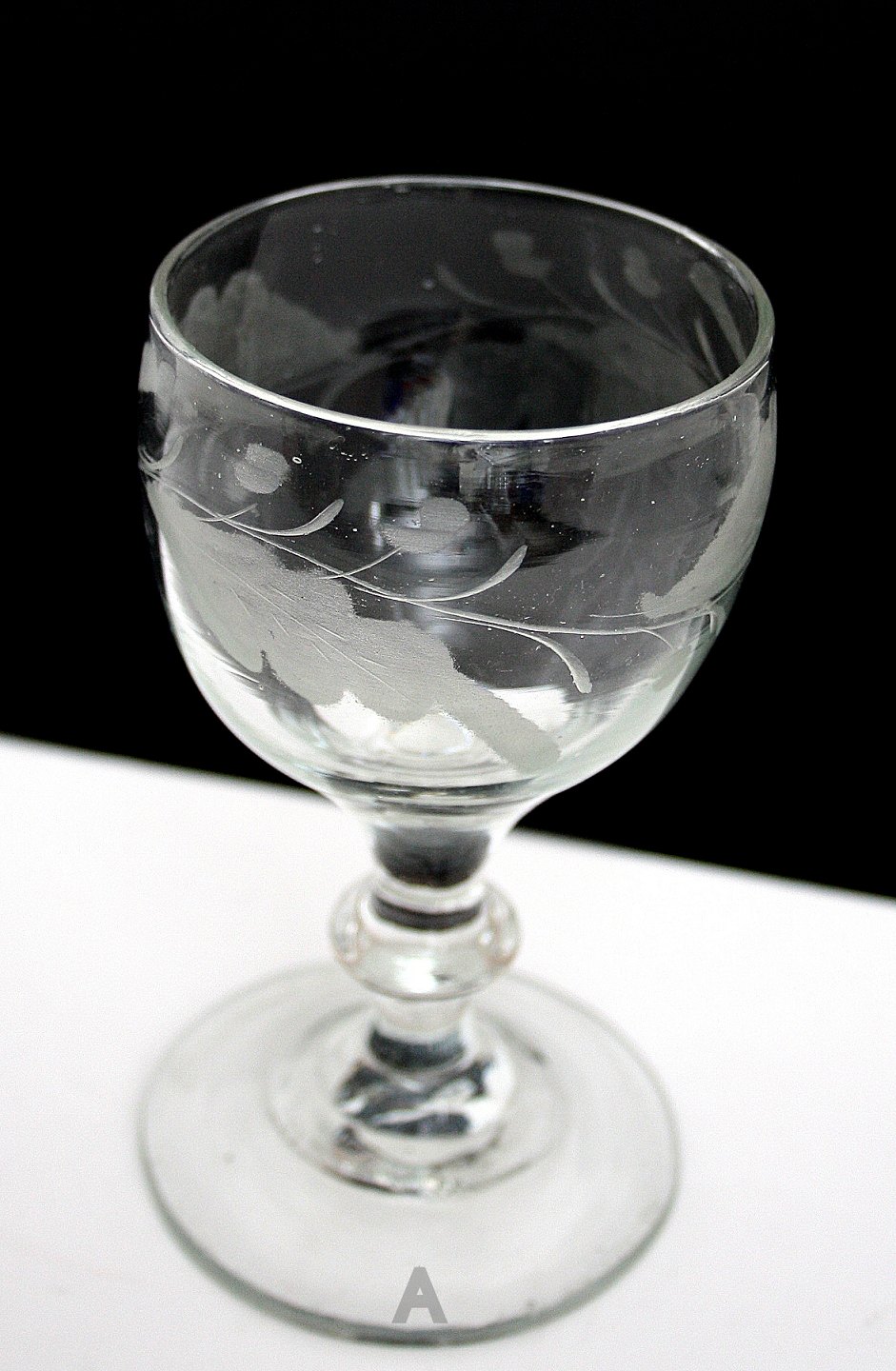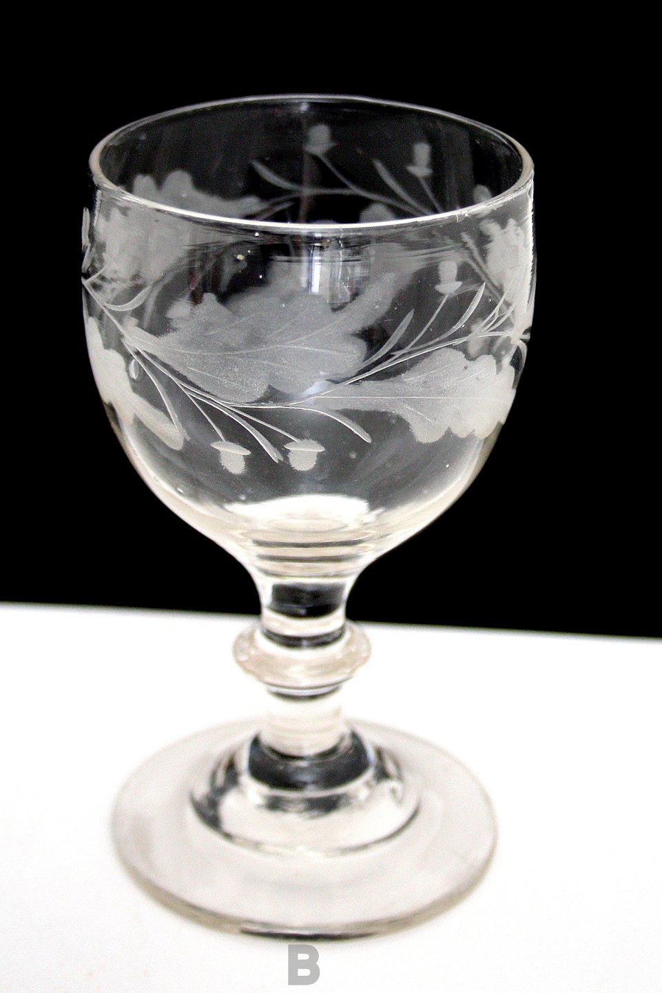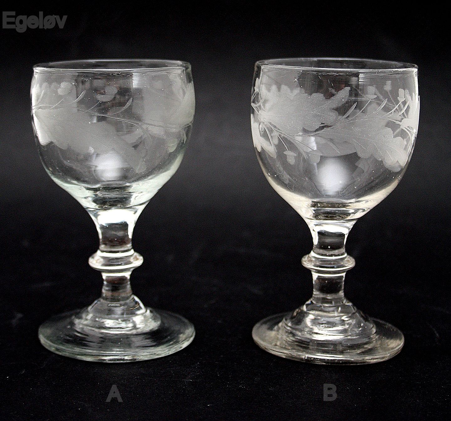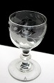 Antagelig Holmegaard glasværk, Egeløv vinglas fra 1853 kataloget. 4 syvfligede fjerlappede blade, der peger med spids skiftevis opad og nedad. 2 agern placeret skiftevis over og under hvert blad. Knækket i bund. Pæn og hel stand.