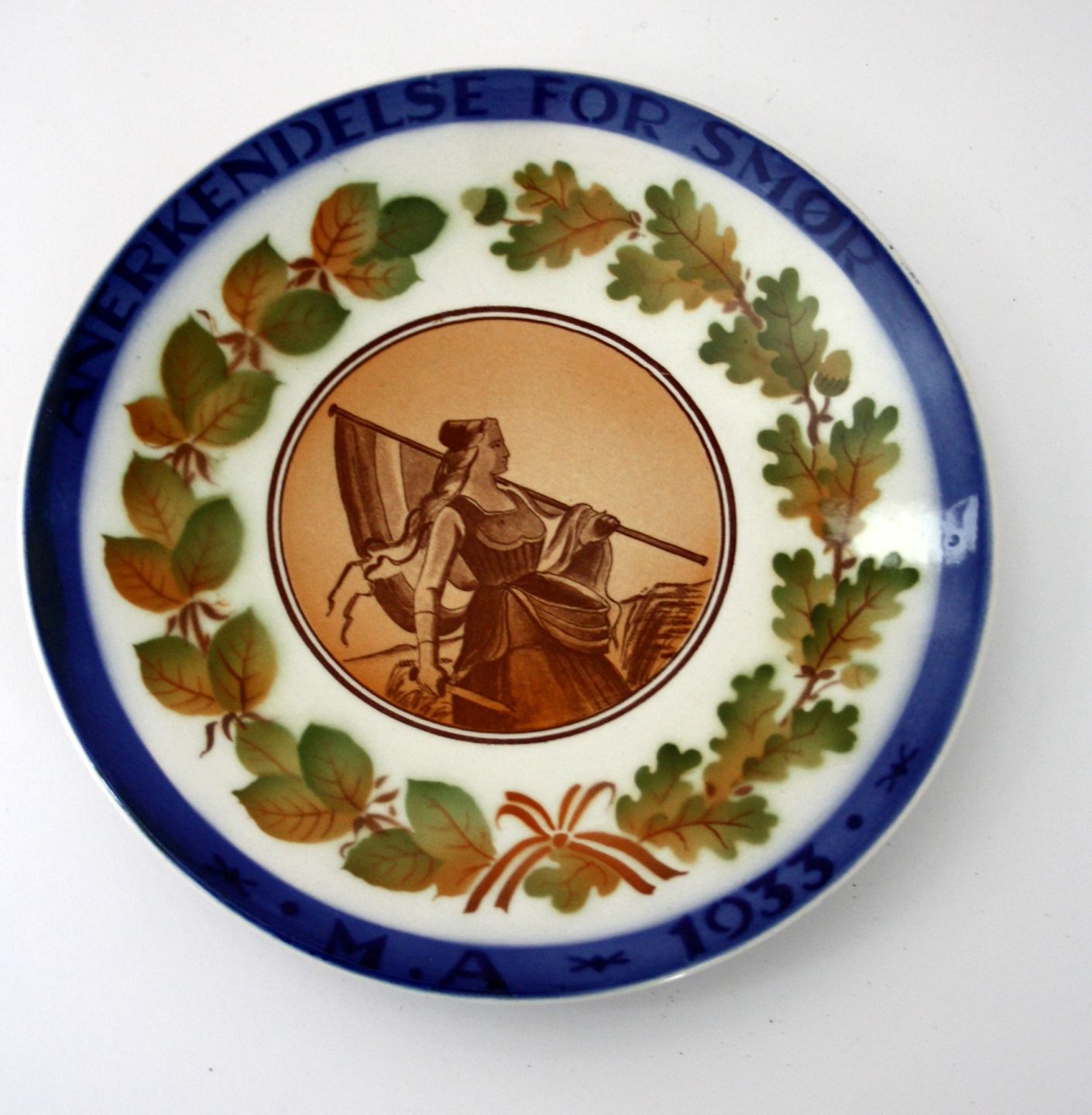 Københavns Fajancefabrik Danmark/Aluminia. Mejeriplatte, Anerkendelse for velbehandlet smør. Maribo Amts Kreds 1933. Luftmalet dekoration efter tegning af Oscar Willerup.