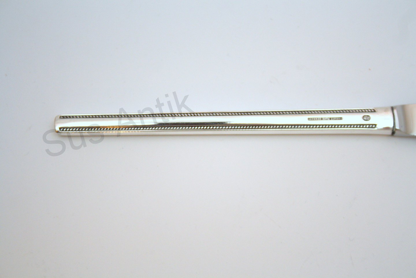 Sølvplet, Farina. Frigast plate Denmark. Stempel DG. Blad rustfrist stål. Kniv. Længde 22 cm. Pris: 175 kr. stk. Lager: 5 Ske. Længde 18,5 cm. Pris: 50 kr. stk. Lager: 1 Sovseske. Længde 20 cm. Pris: 150 kr stk. Lager: 1