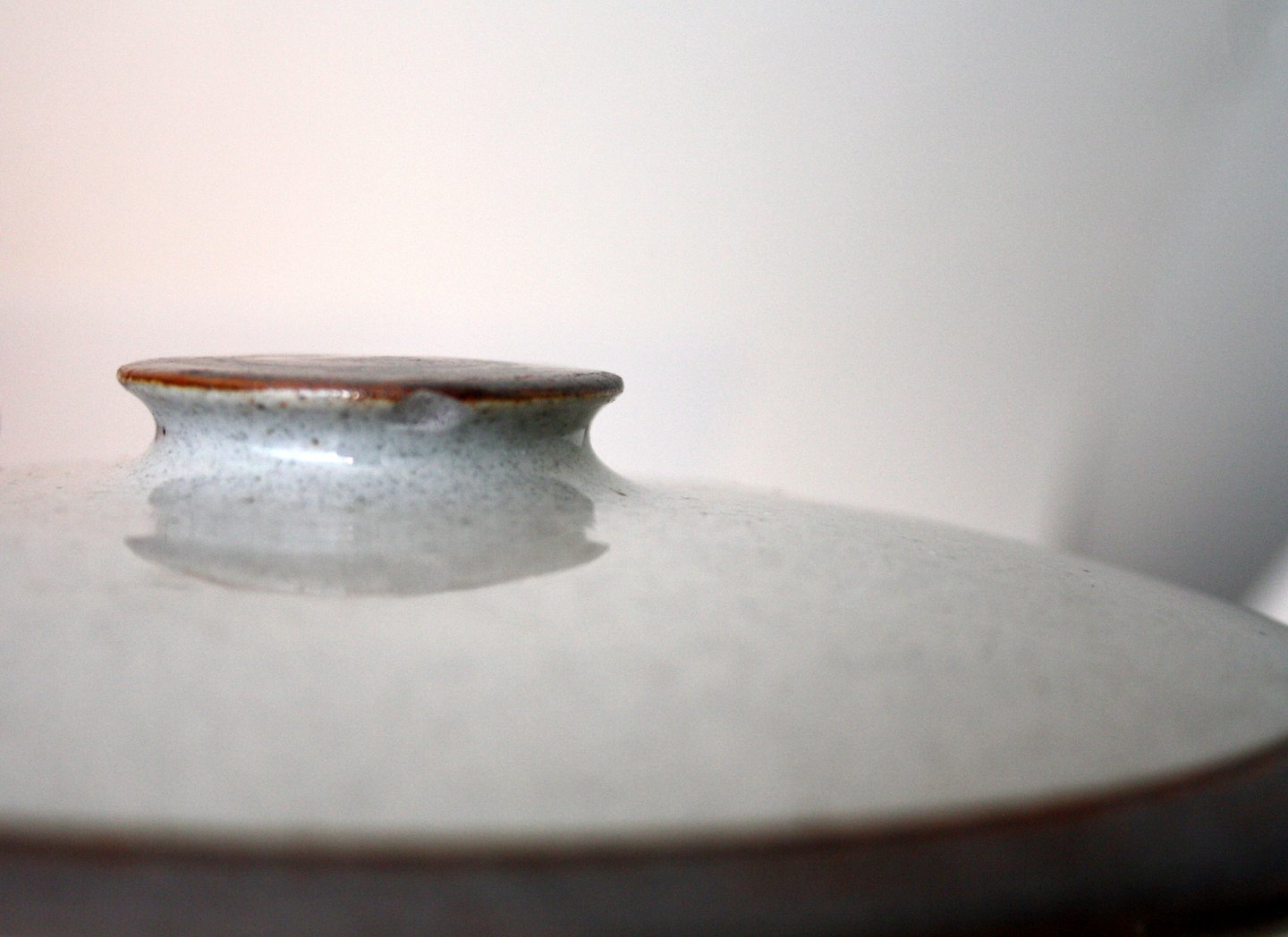 Gryde med låg. Højde 11 cm. Diameter 17,5 cm. Overfladekrakelering på låg. Pris: SOLGT