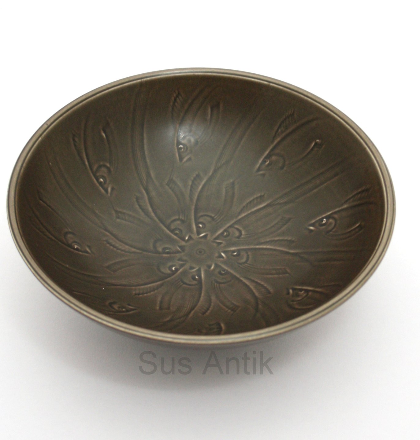 Aluminia, Solbjerg kunststengods fra 1934 designet af Nils Thorsson. Brun skål med fisk indridset i selve originalformen. Glasuren er mat. Formnr. 1585. Diameter 18 cm. Højde 6,3 cm.